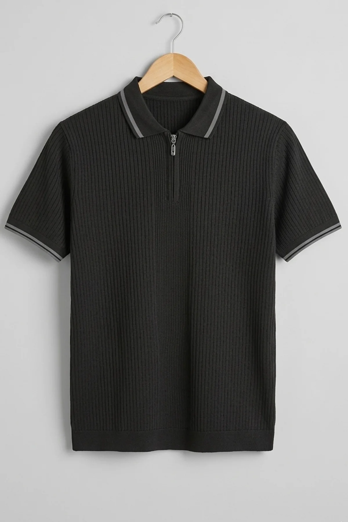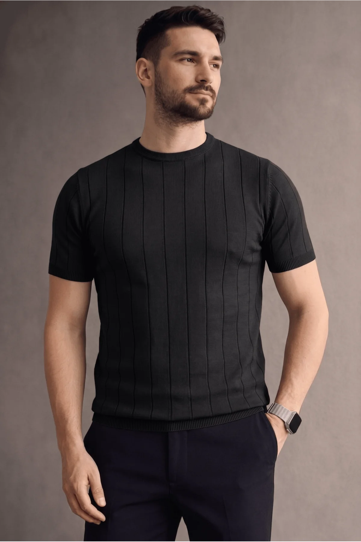 Erkek Bisiklet Yaka Çizgili Triko Tişört Siyah Cd163