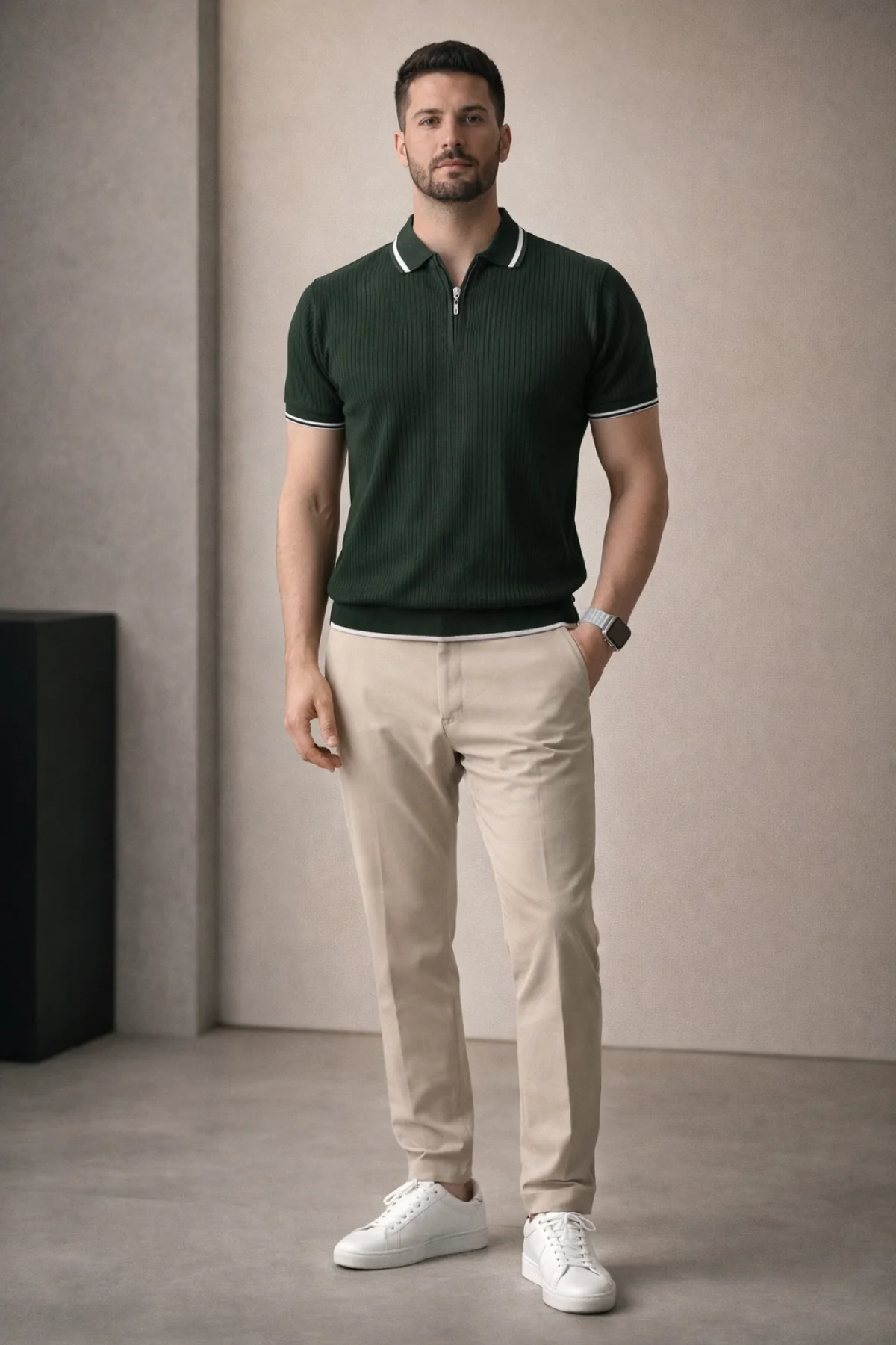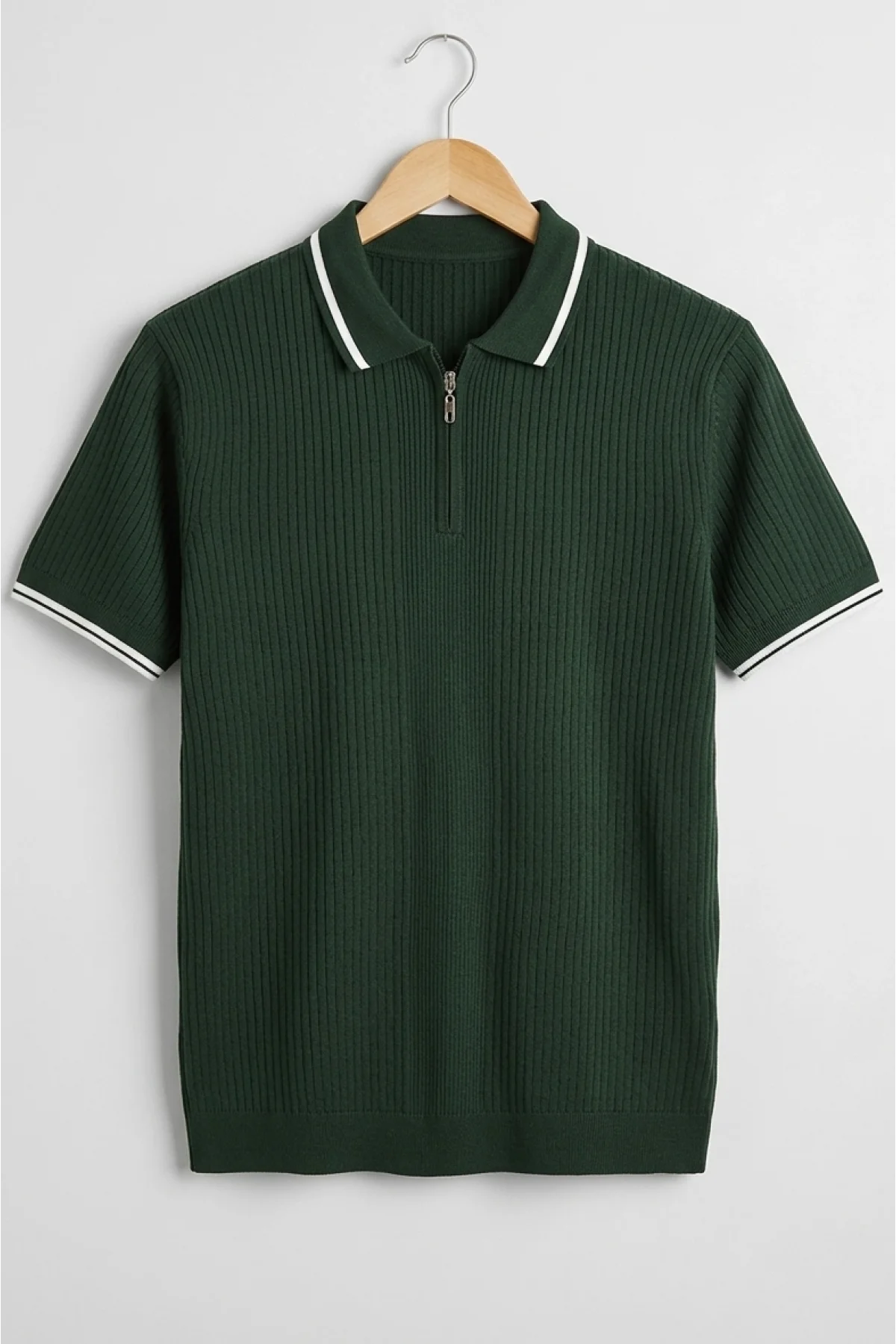 Erkek Yarım Fermuarlı Polo Yaka Normal Kalıp Kazak Yeşil Cd101