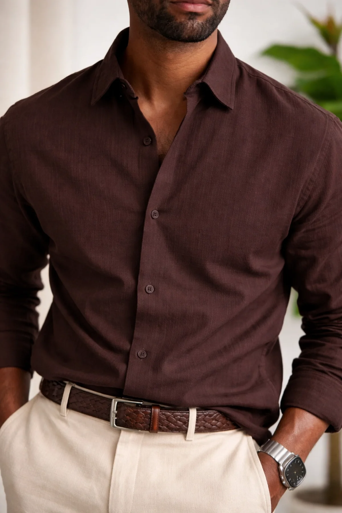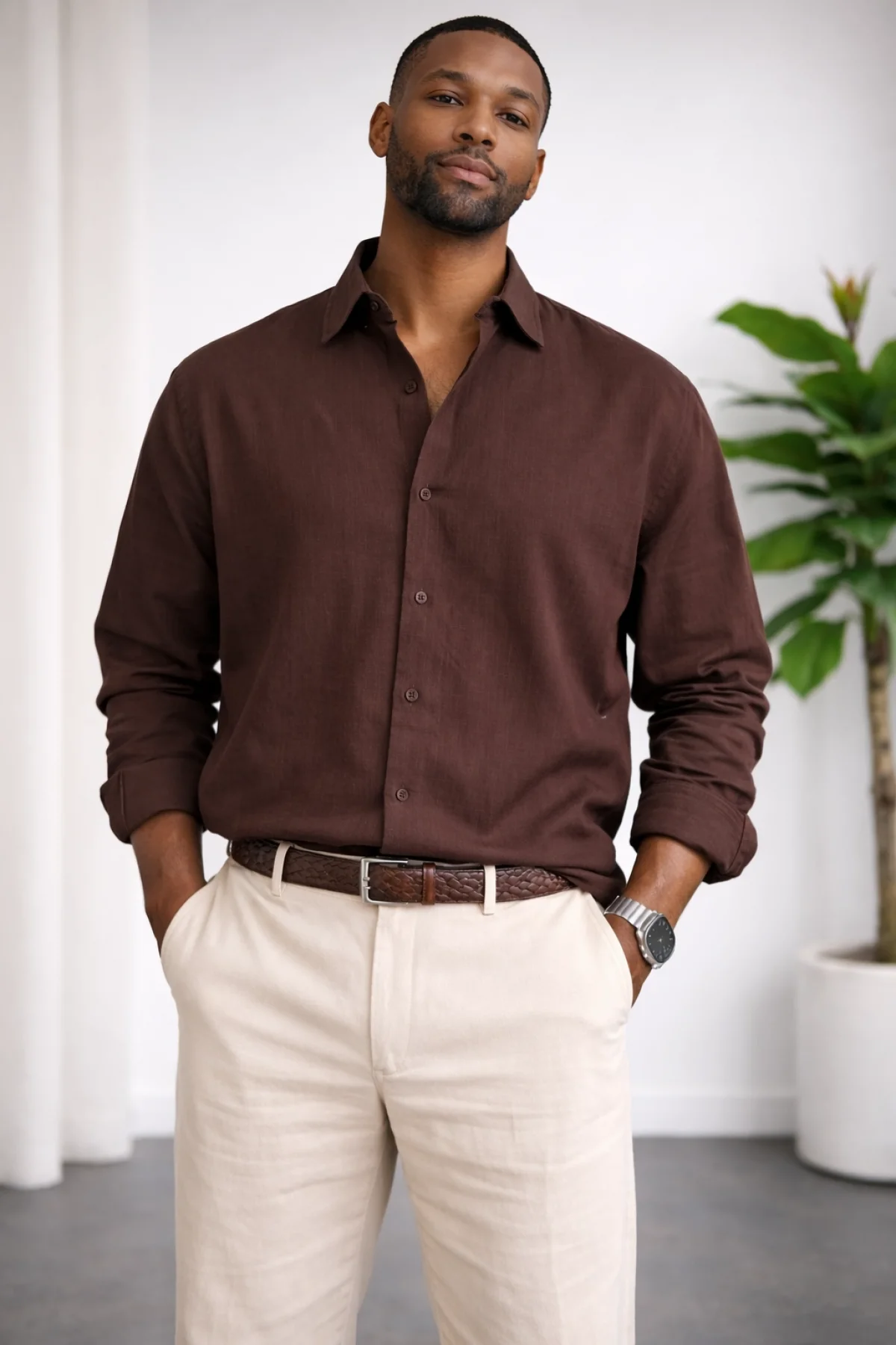 Erkek Keten Görünümlü Pamuklu Gömlek Acı Kahve Cd158