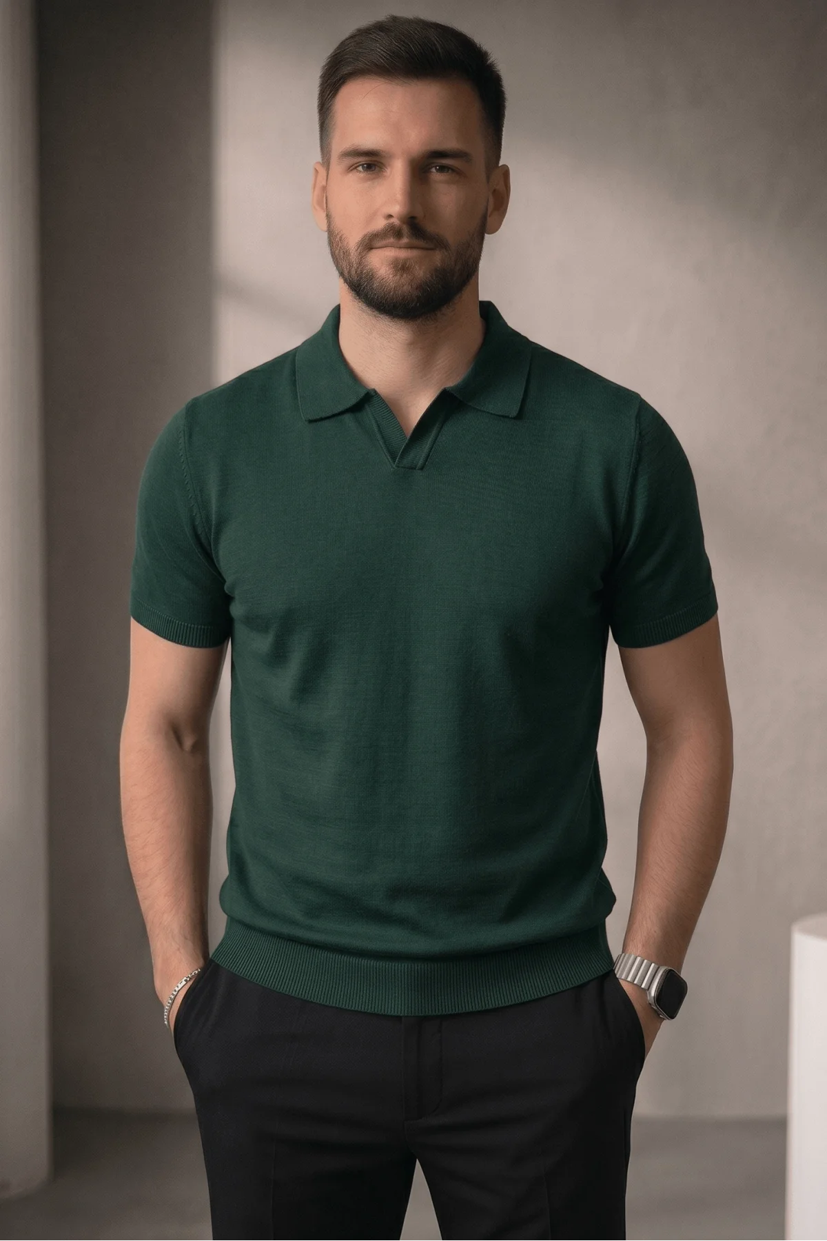 Erkek Açık Yaka Düz Triko Tişört Yeşil Cd167