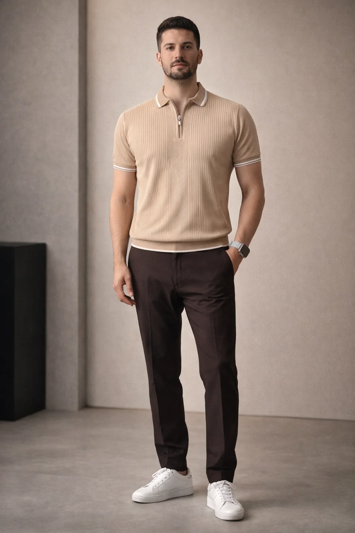 Erkek Polo Yaka Çizgili Tişört Açık Kahverengi Cd177