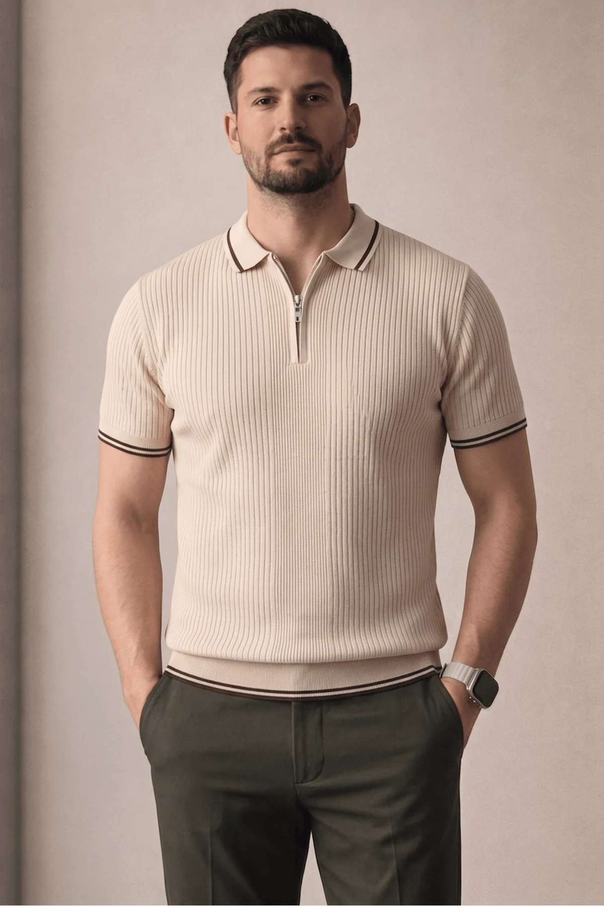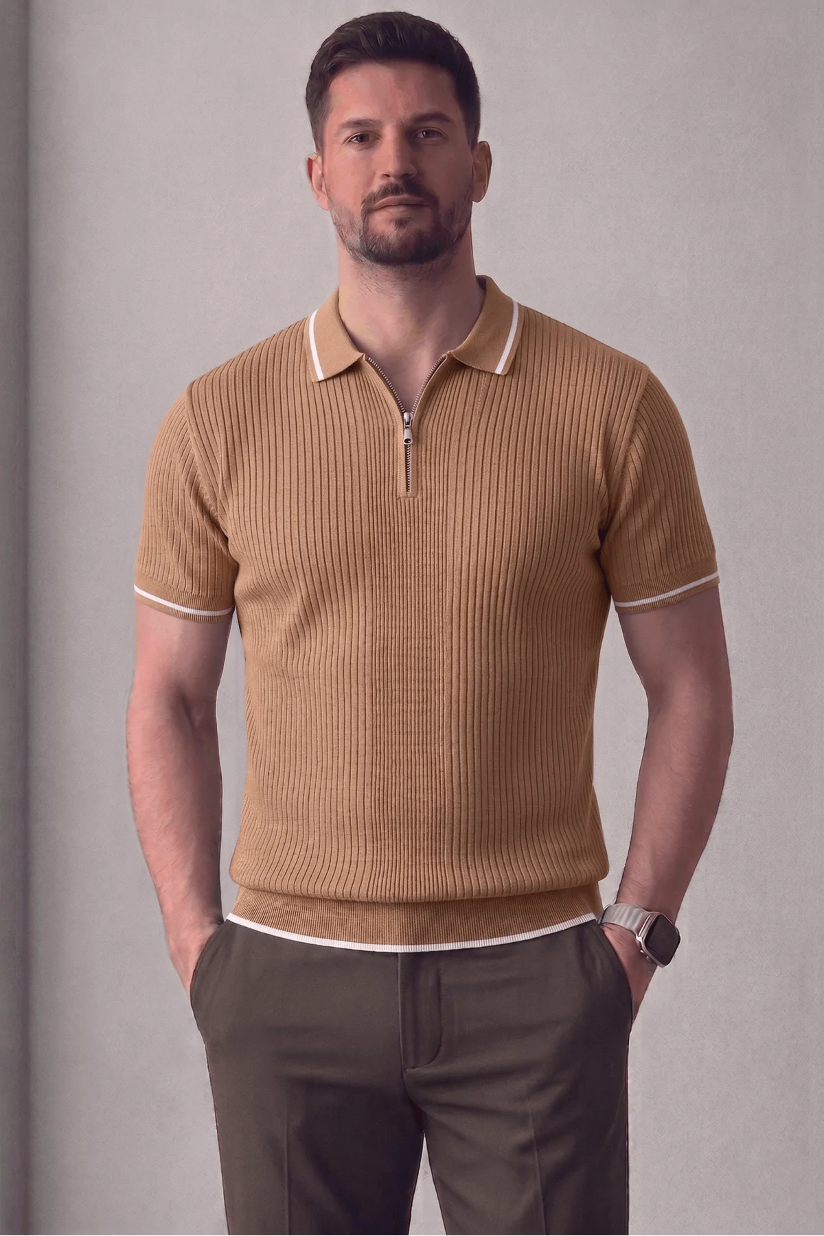 Erkek Bisiklet Yaka Çizgili Triko Tişört Vizon Cd163
