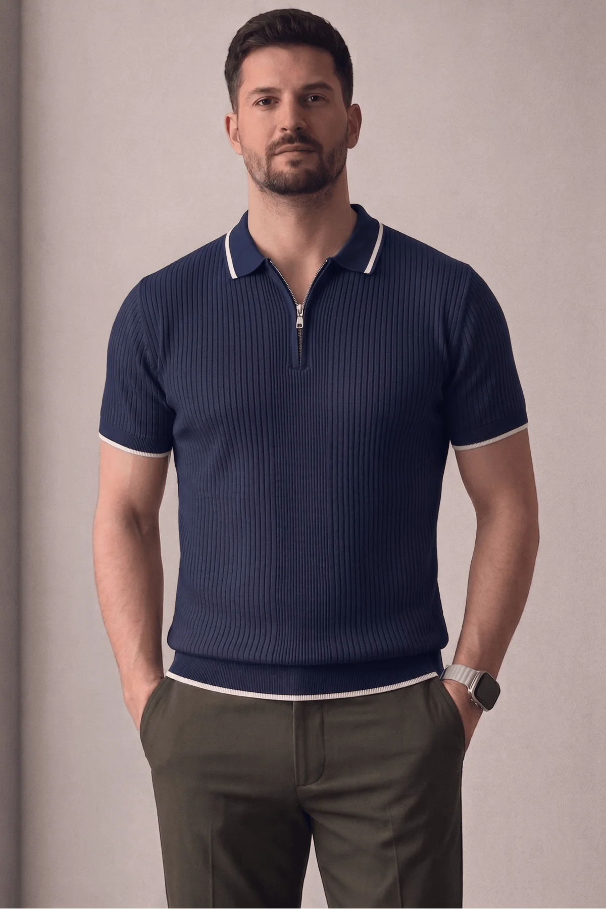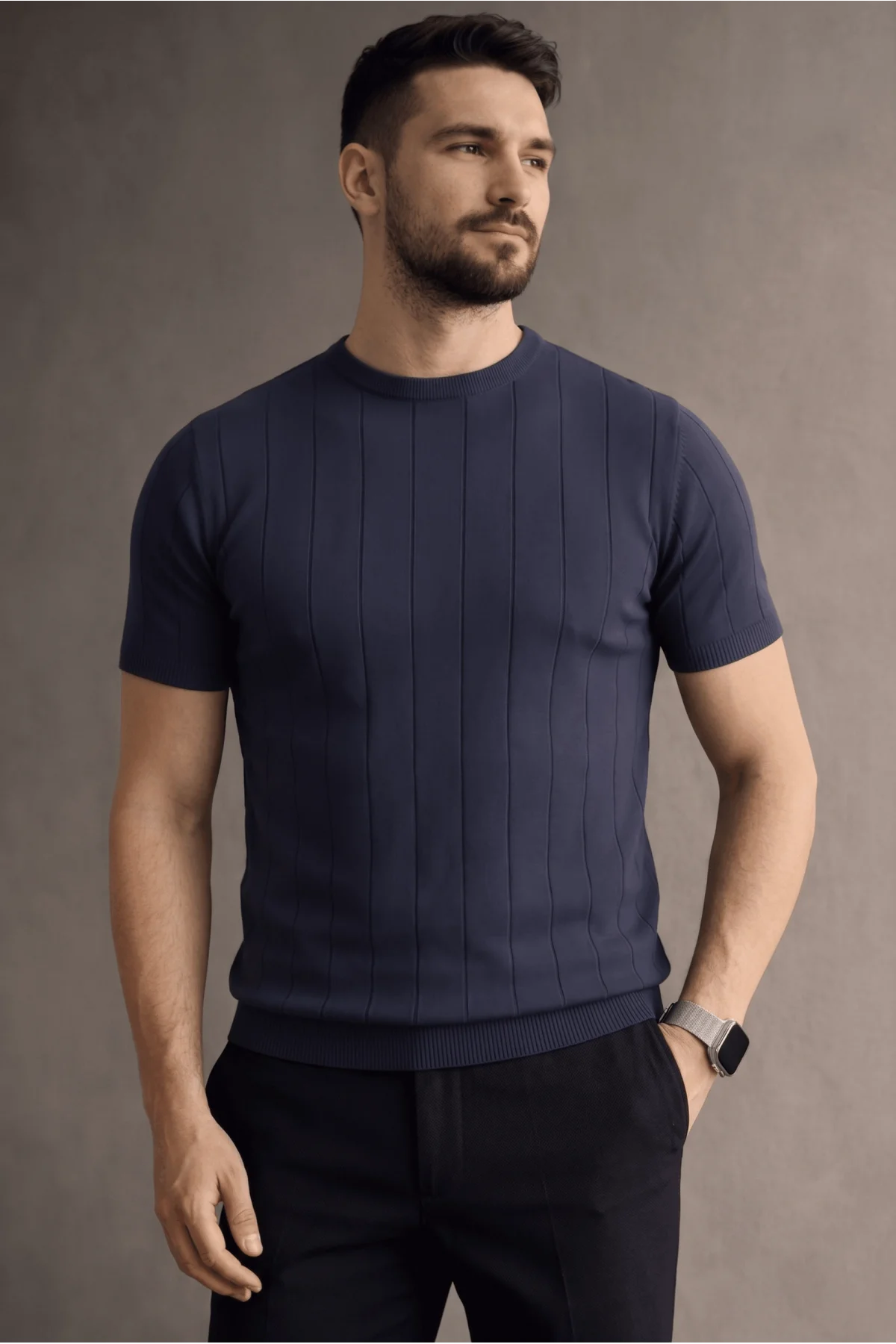 Erkek Bisiklet Yaka Çizgili Triko Tişört Lacivert Cd163