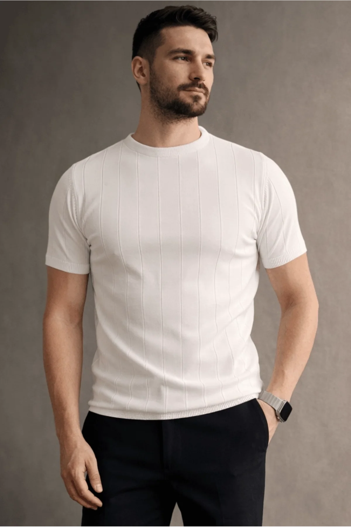 Erkek Bisiklet Yaka Çizgili Triko Tişört Beyaz Cd163