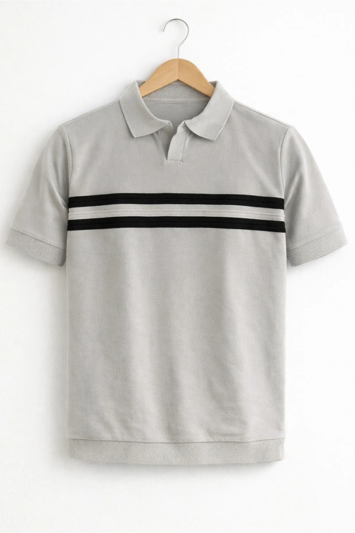 Erkek Açık Yaka Çizgi Desenli Triko Tişört Gri Cd176