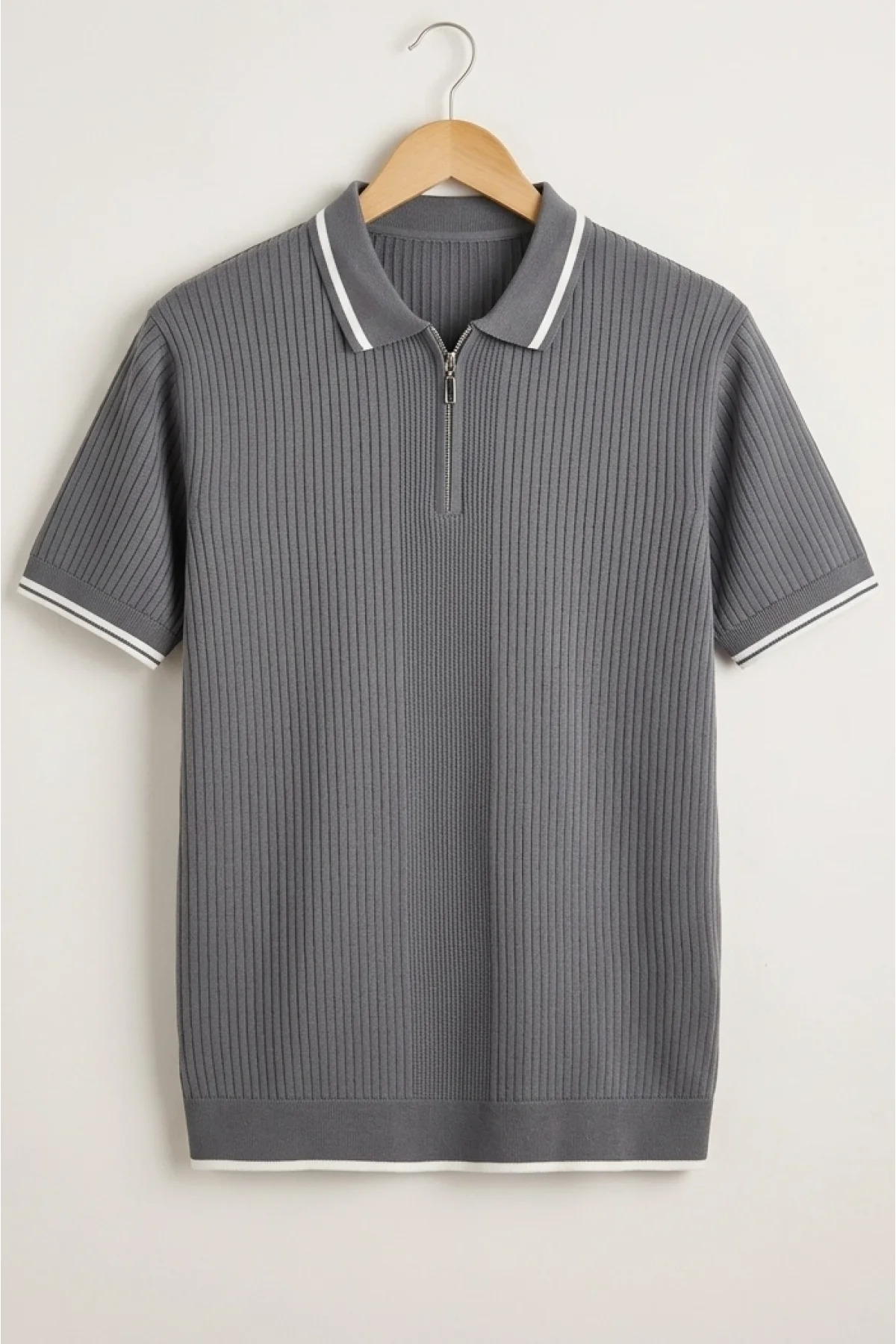 Erkek Açık Yaka Bloklu Triko Tişört Gri Cd174