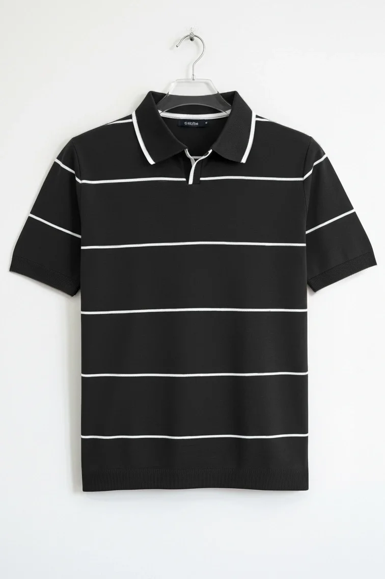 ERKEK AÇIK YAKA ÇİZGİLİ TRİKO TİŞÖRT SİYAH CD151
