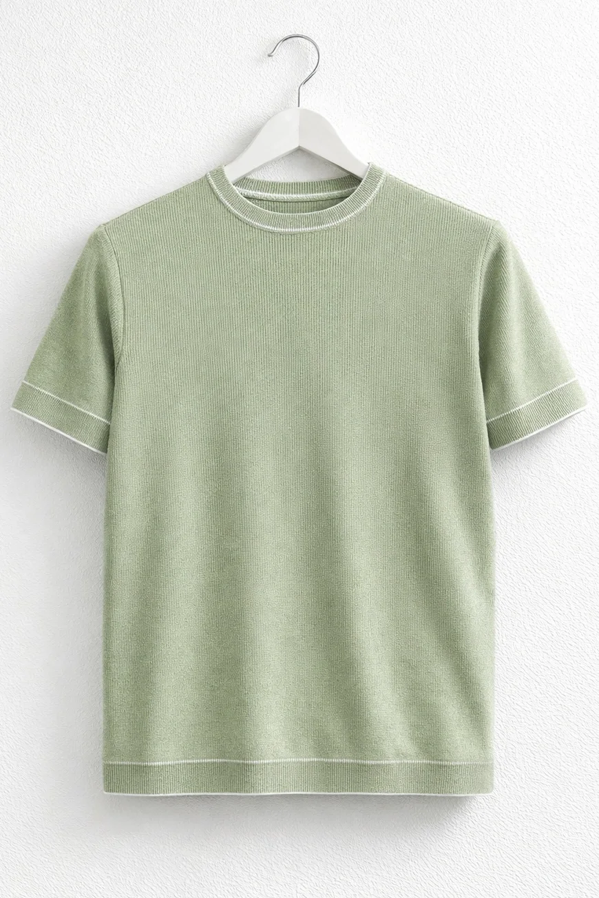Erkek Açık Yaka Bloklu Triko Tişört Açık Yeşil Cd174