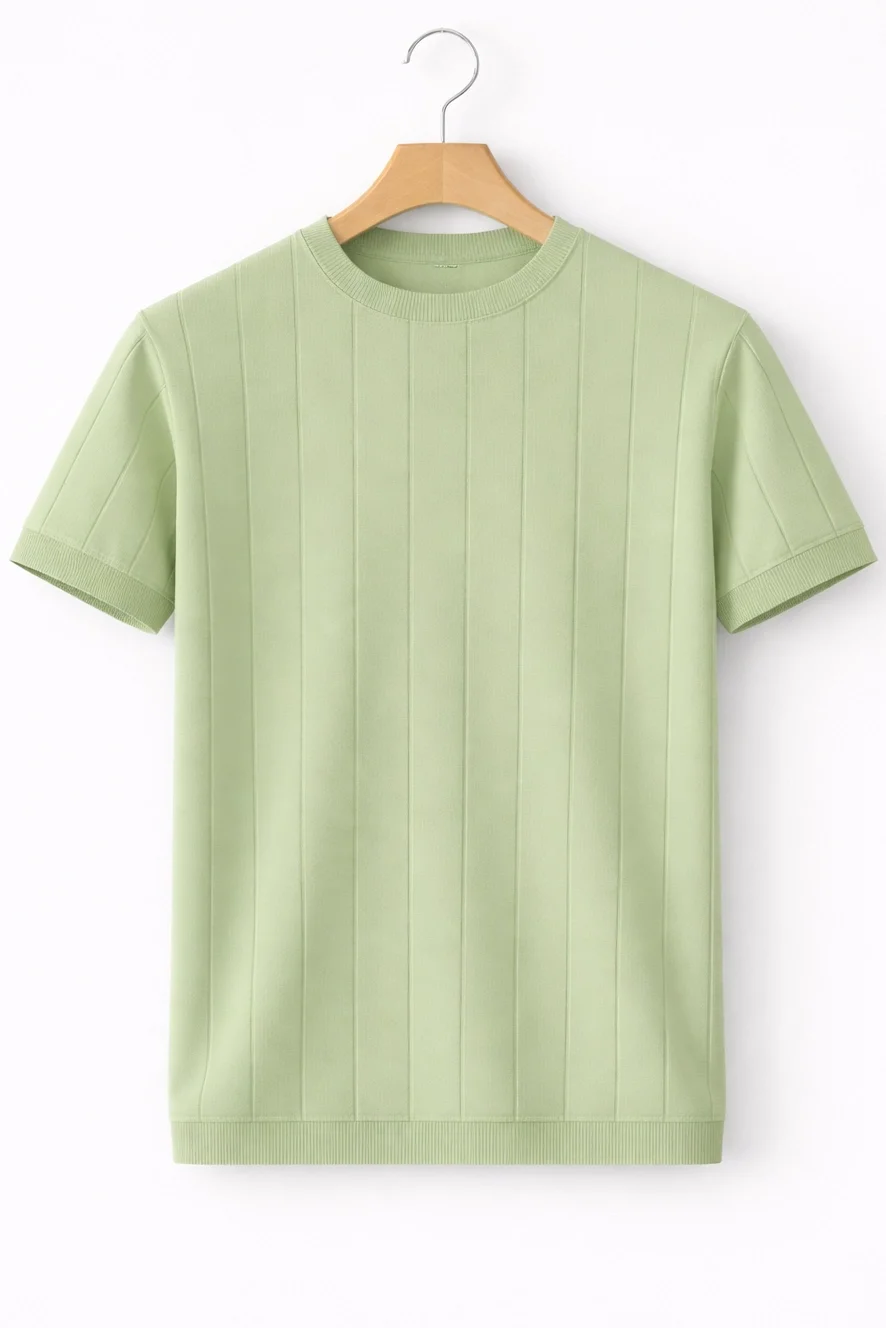 Erkek Açık Yaka Bloklu Triko Tişört Açık Yeşil Cd174
