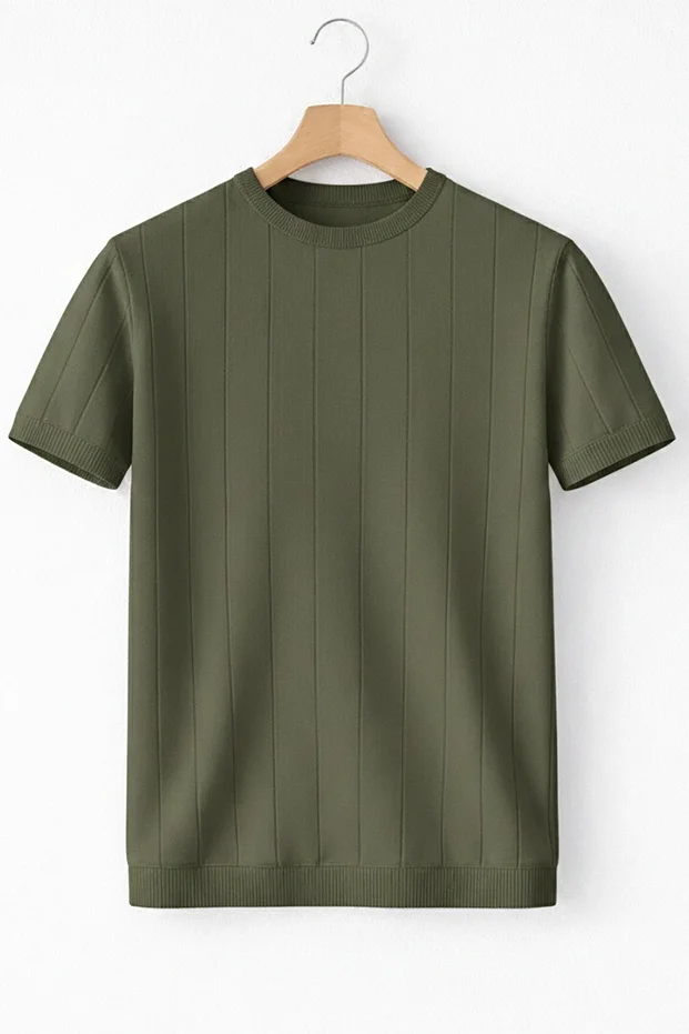 Erkek Açık Yaka Bloklu Triko Tişört Haki Cd174