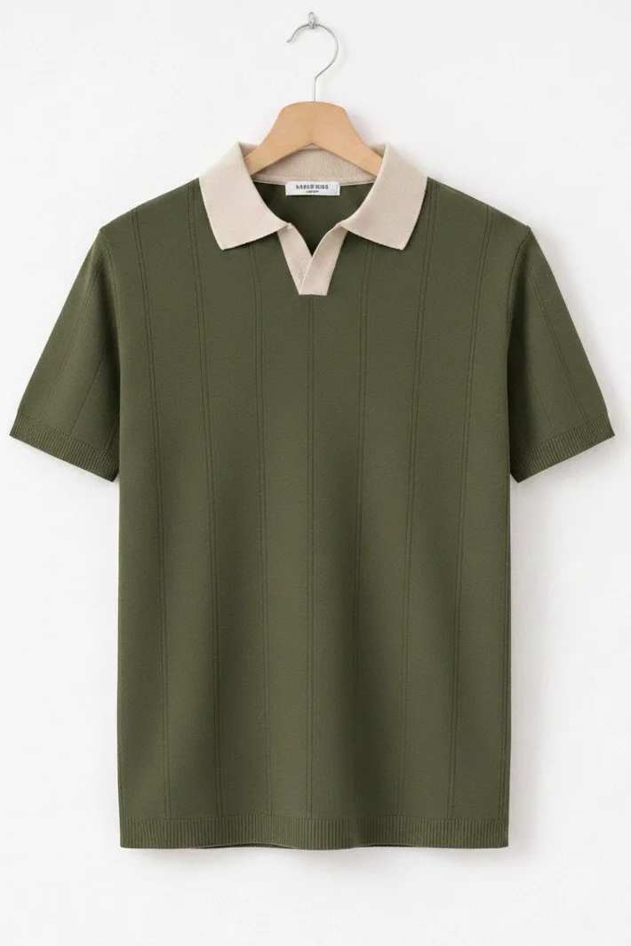 Erkek Açık Yaka Bloklu Triko Tişört Haki Cd174