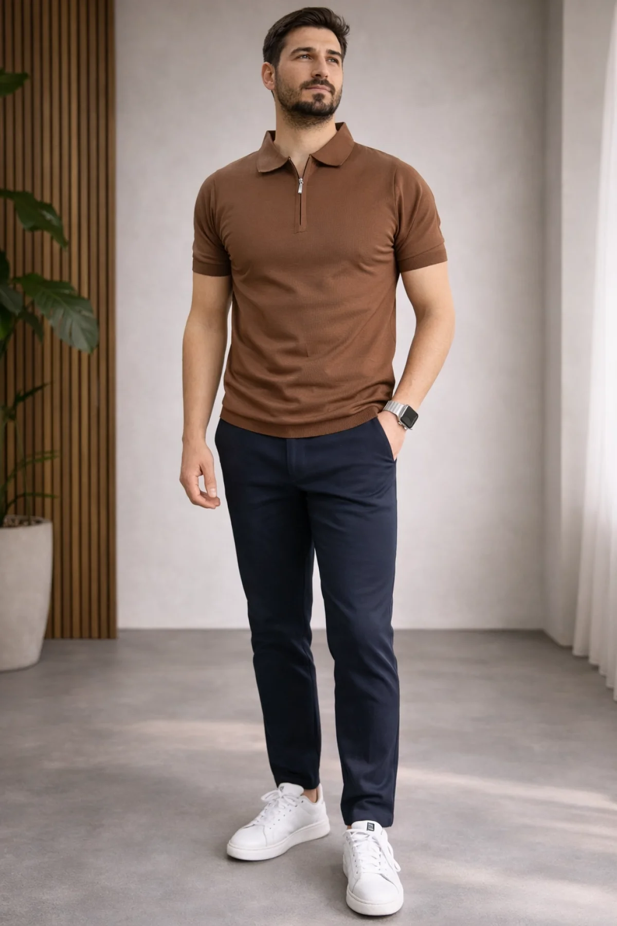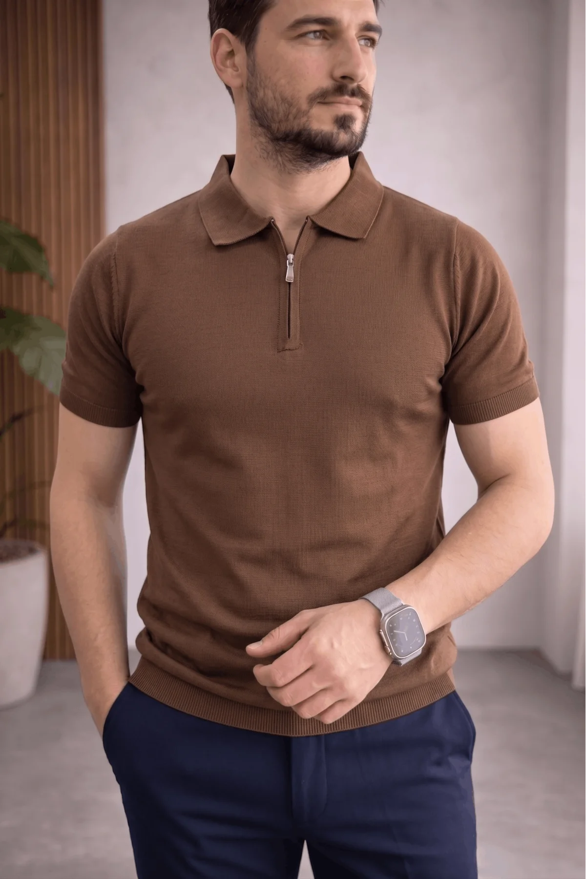 Erkek Polo Yaka Düz Triko Tişört Kahverengi Cd173
