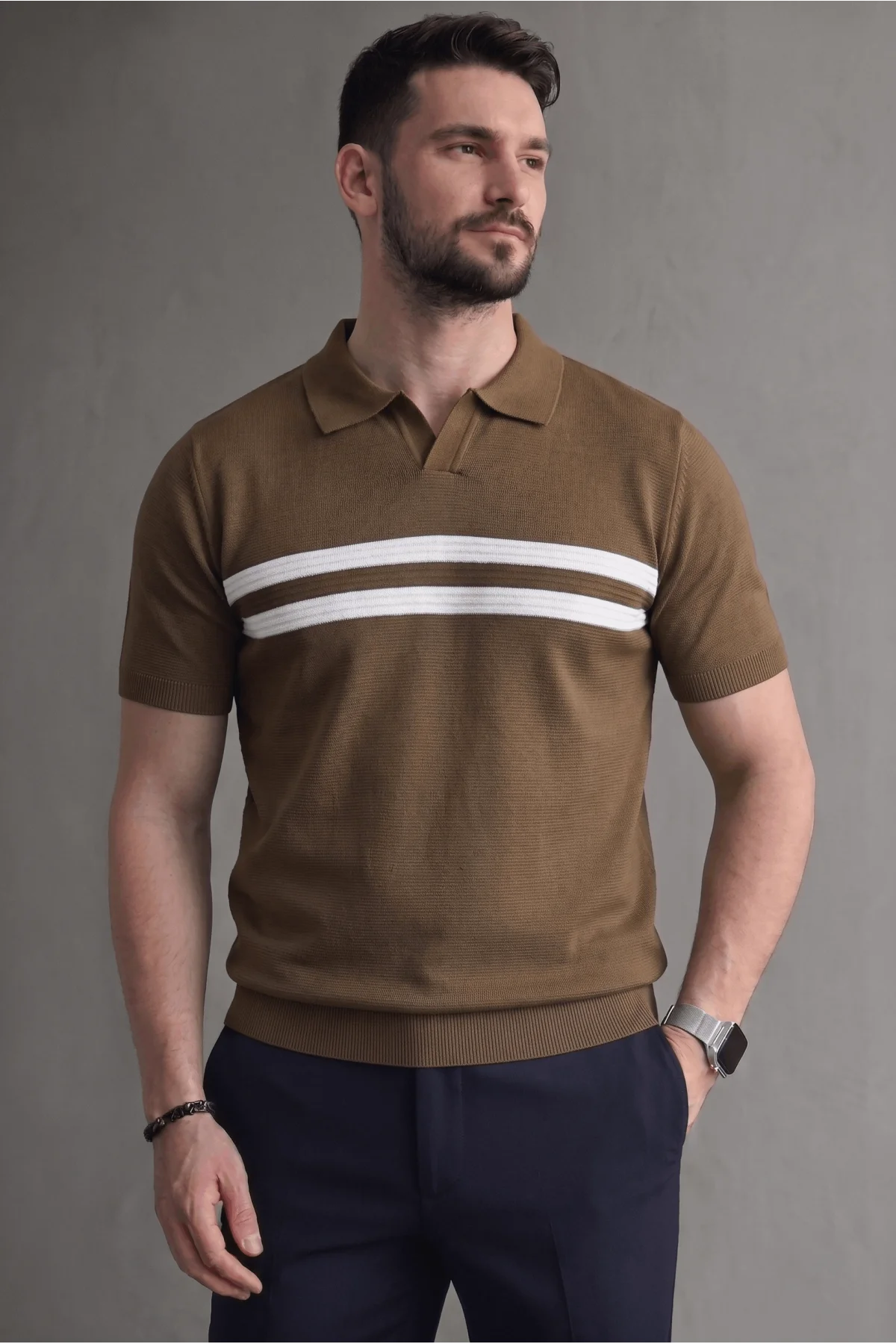 Erkek Açık Yaka Çizgi Desenli Triko Tişört Açık Kahverengi Cd176