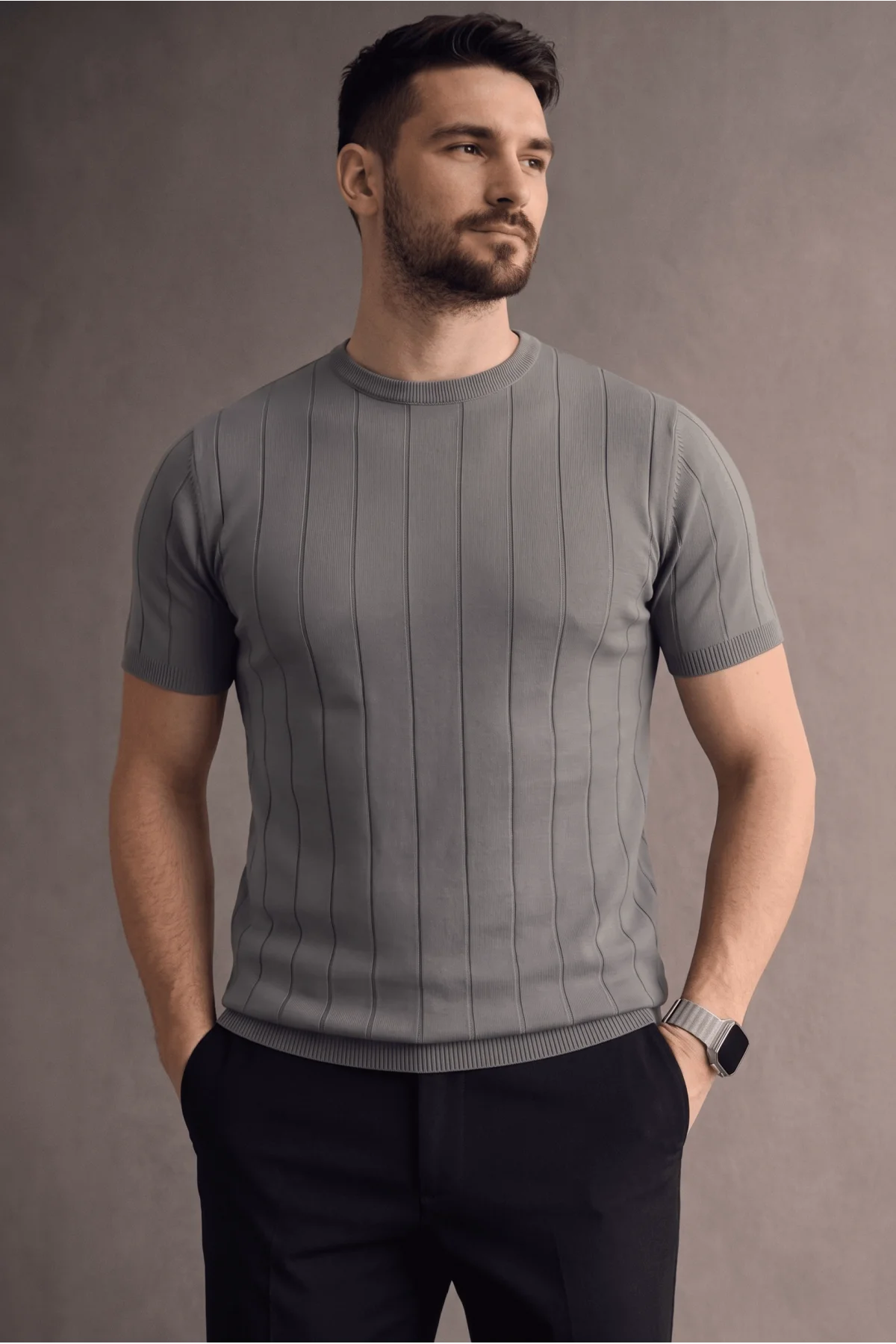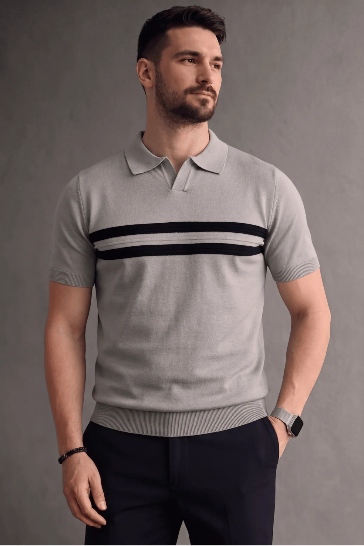 Erkek Açık Yaka Çizgi Desenli Triko Tişört Gri Cd176