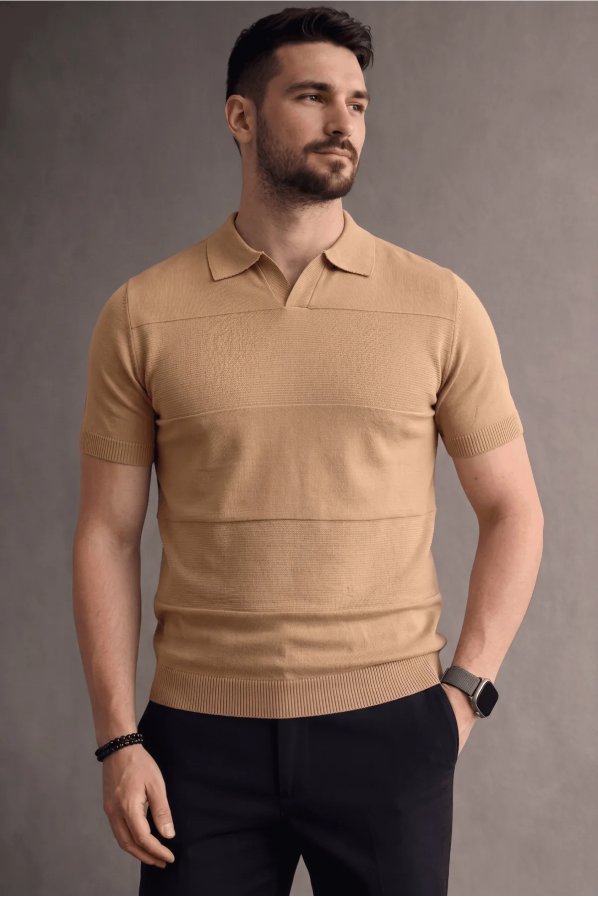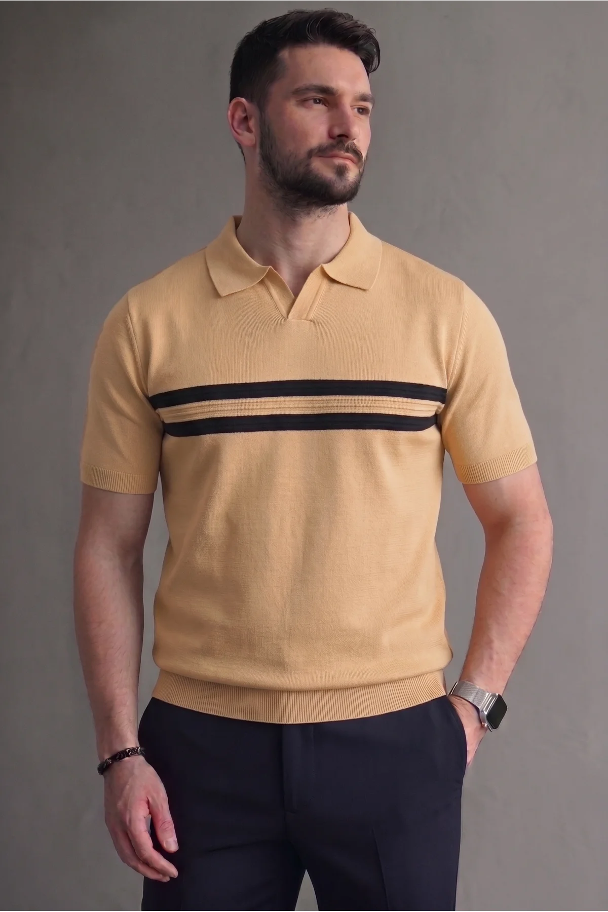 Erkek Bisiklet Yaka Çizgili Triko Tişört Vizon Cd163