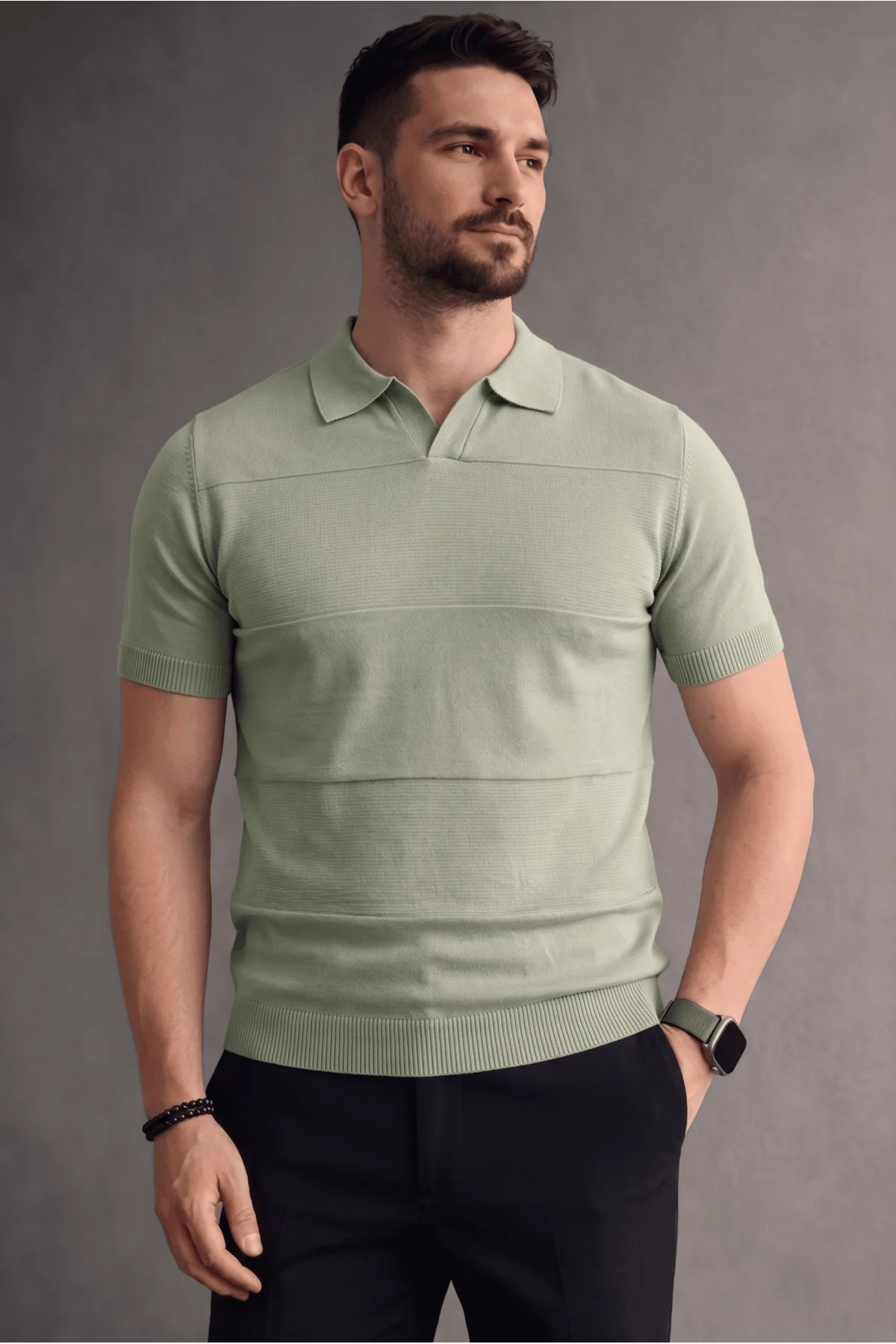 Erkek Açık Yaka Bloklu Triko Tişört Açık Yeşil Cd174