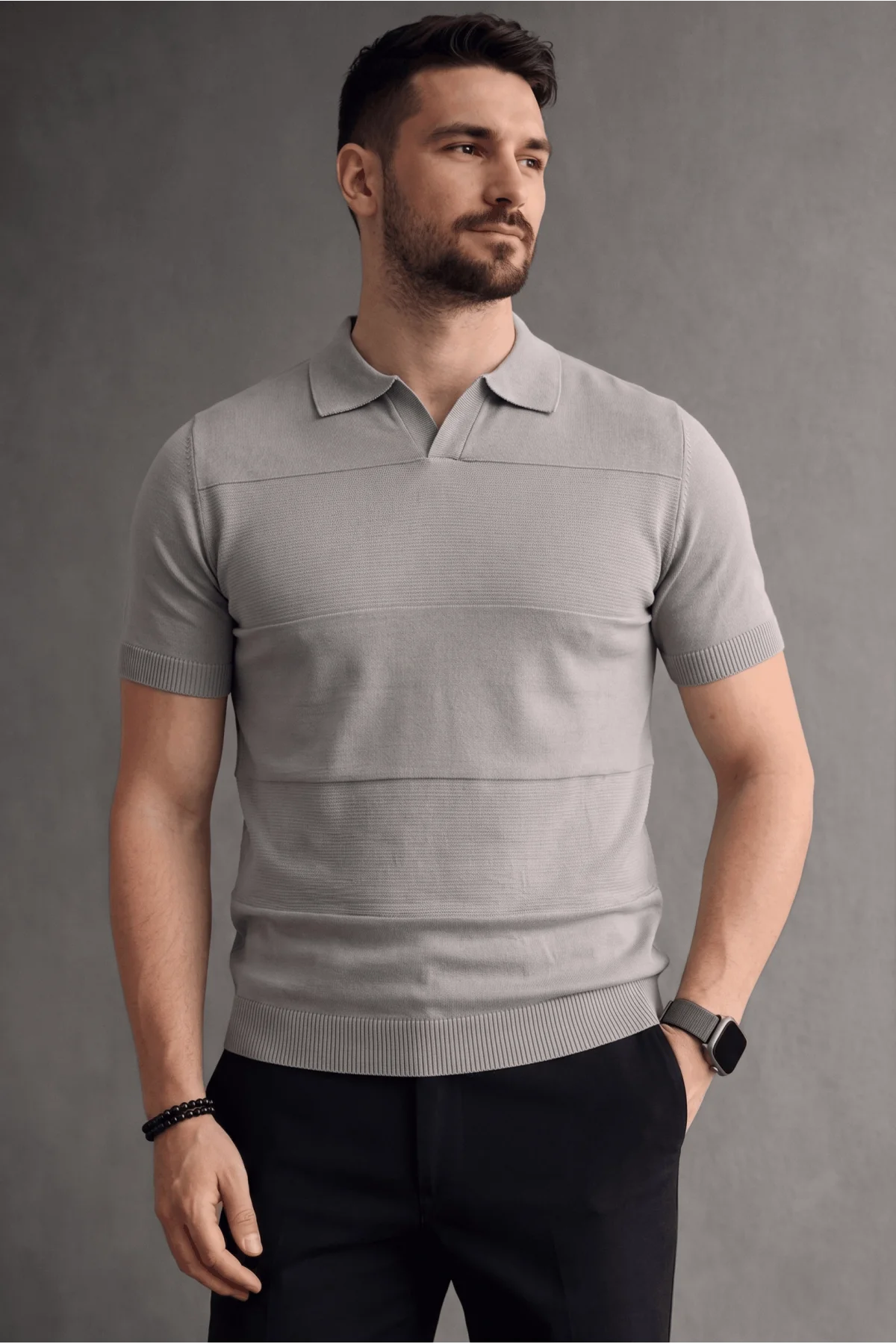Erkek Açık Yaka Bloklu Triko Tişört Gri Cd174
