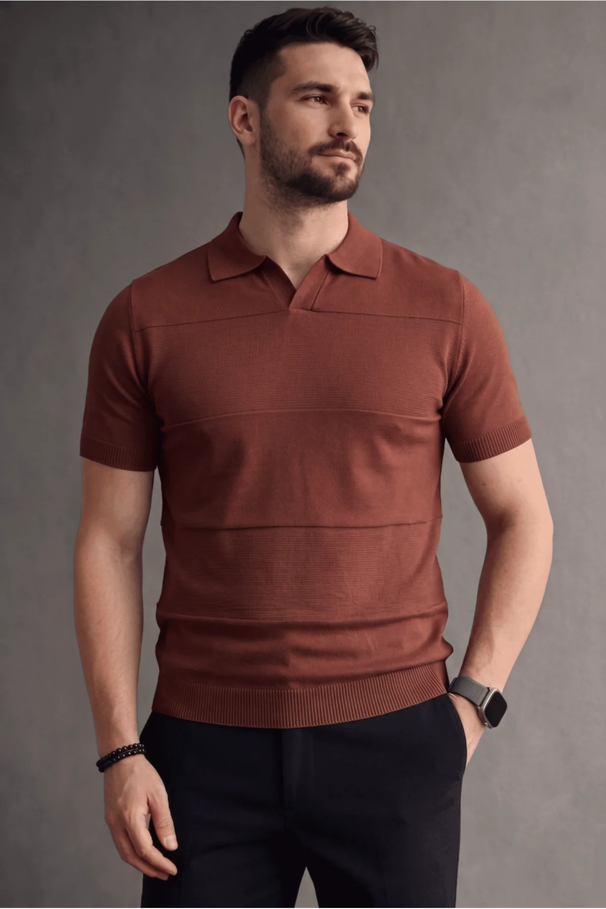 Erkek Açık Yaka Bloklu Triko Tişört Kiremit Cd174