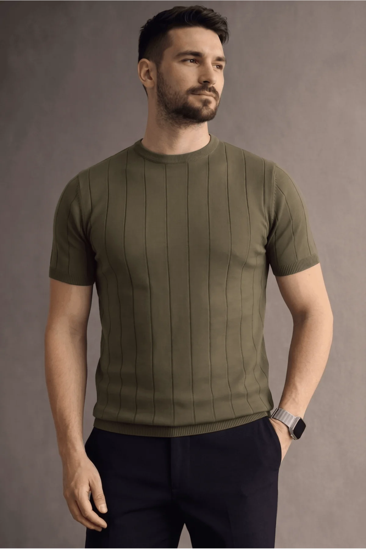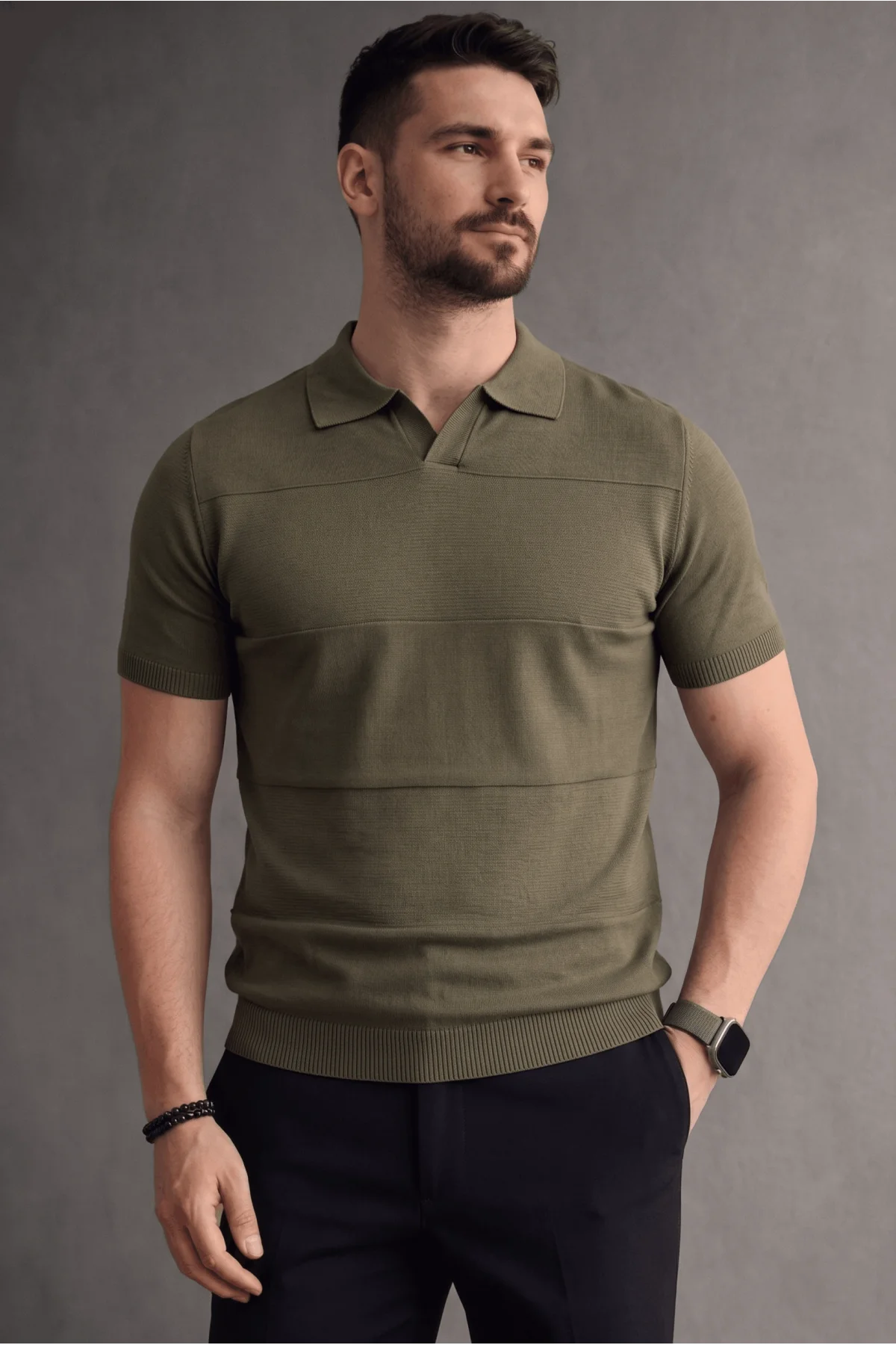 Erkek Açık Yaka Bloklu Triko Tişört Haki Cd174