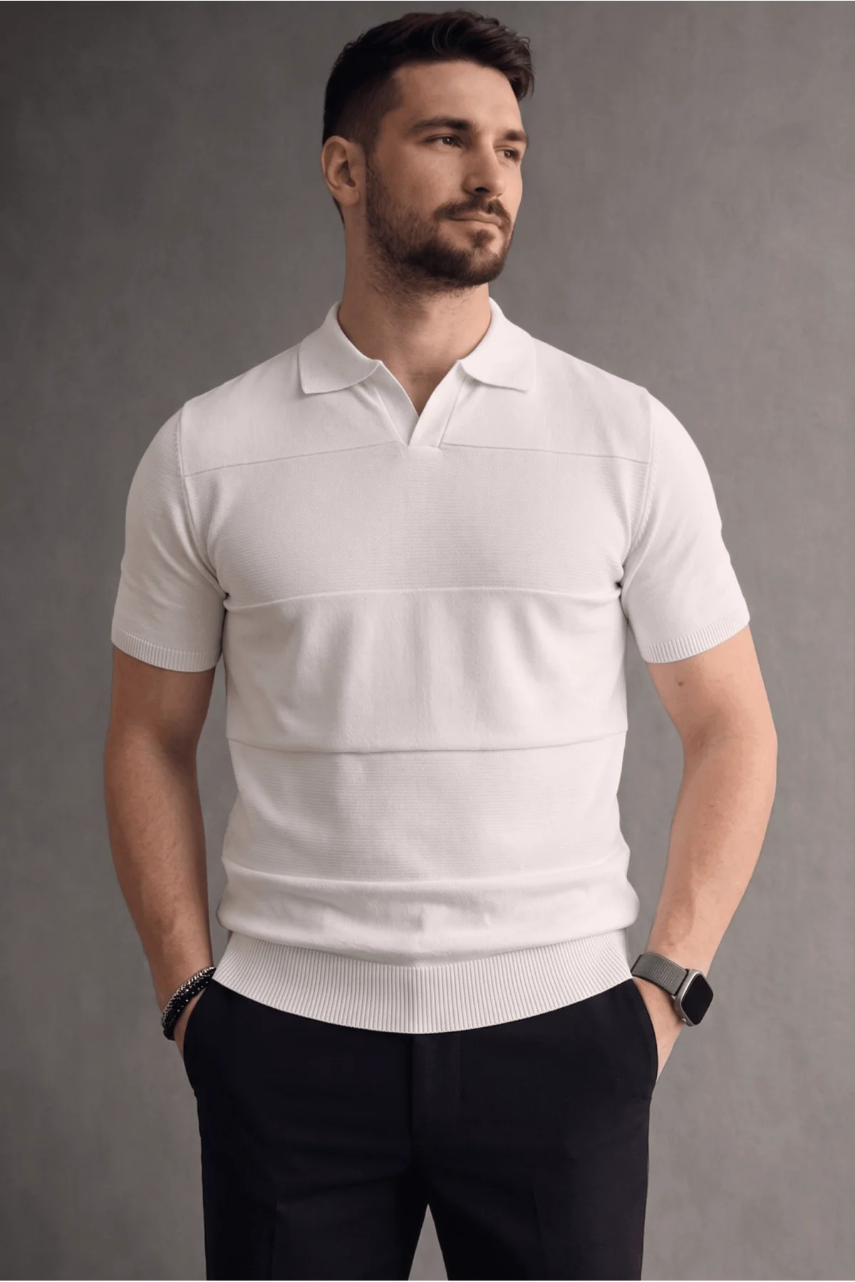 Erkek Açık Yaka Bloklu Triko Tişört Beyaz Cd174