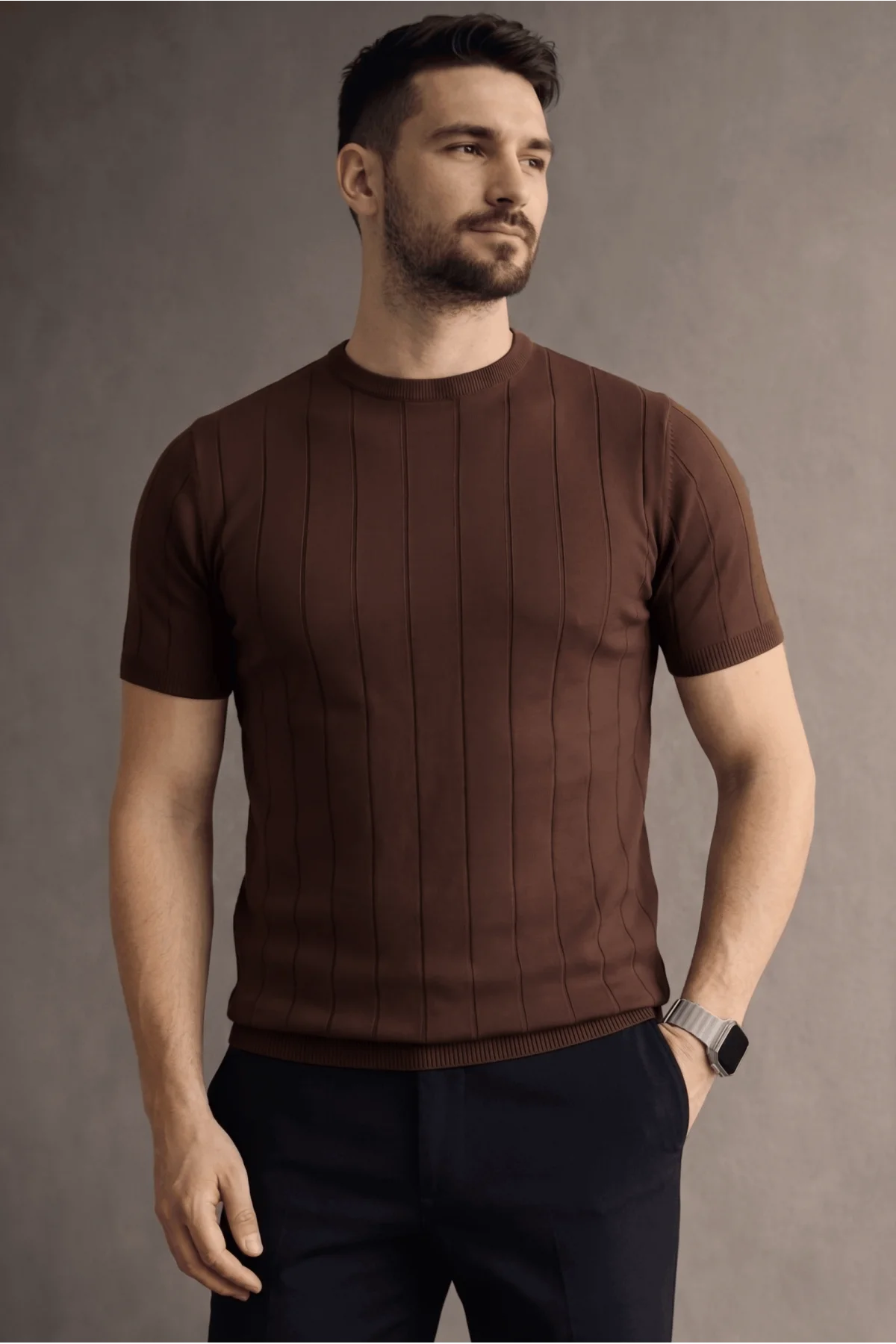 Erkek Bisiklet Yaka Çizgili Triko Tişört Kahverengi Cd163
