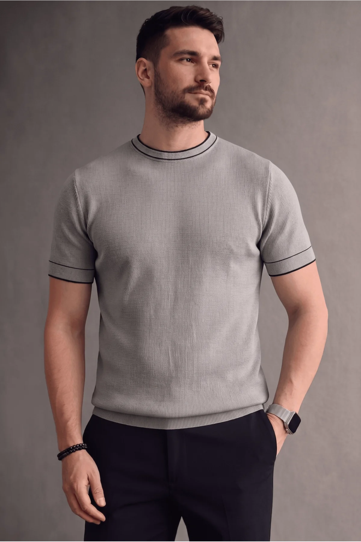 Erkek Bisiklet Yaka Çizgi Desenli Triko Tişört Gri Cd170