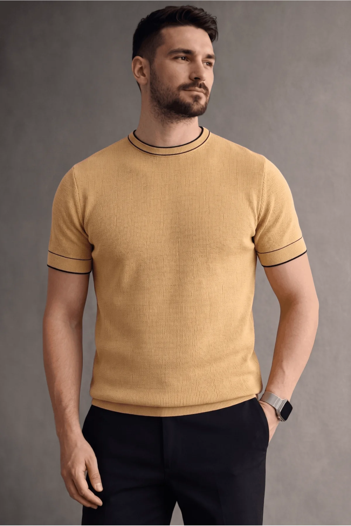 Erkek Bisiklet Yaka Çizgili Triko Tişört Vizon Cd163