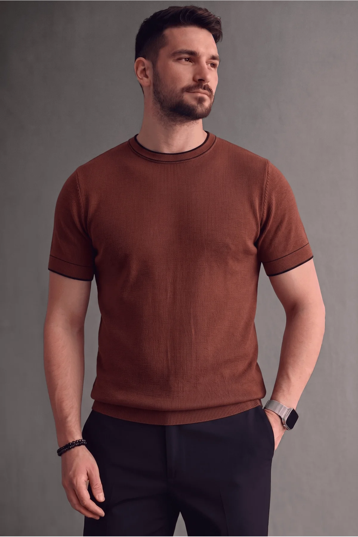 Erkek Bisiklet Yaka Çizgi Desenli Triko Tişört Kiremit Cd170