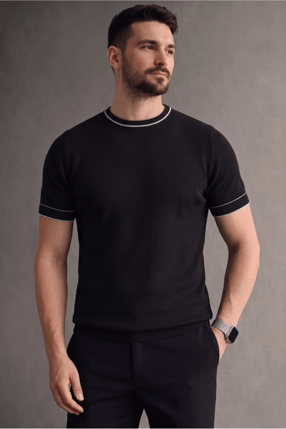 Erkek Bisiklet Yaka Çizgi Desenli Triko Tişört Siyah Cd170