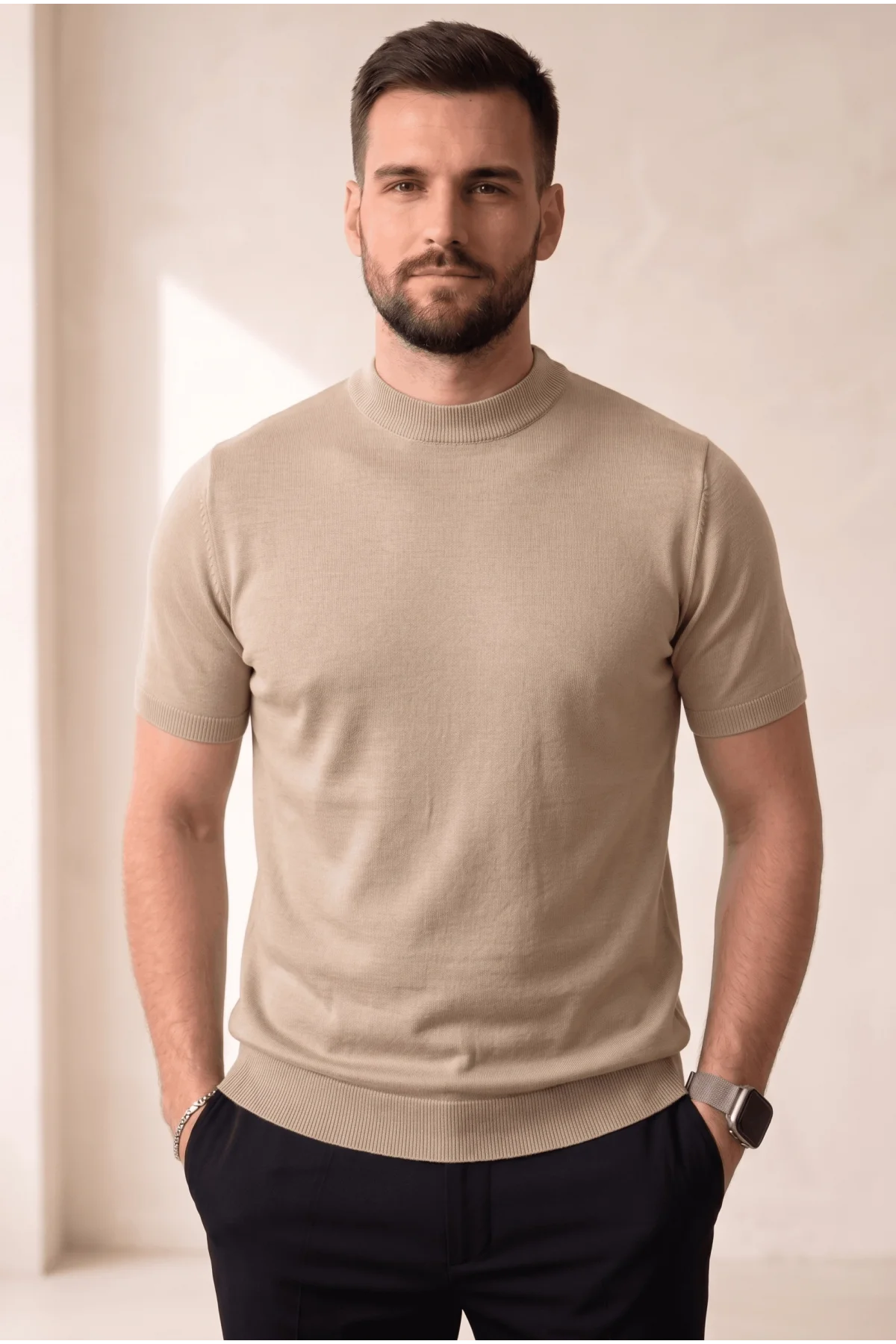 Erkek Düz Bisiklet Yaka Triko Tişört Vizon Cd169