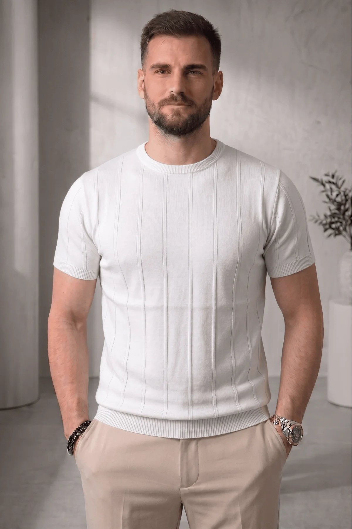 Erkek Açık Yaka Çizgili Triko Tişört Beyaz Cd151