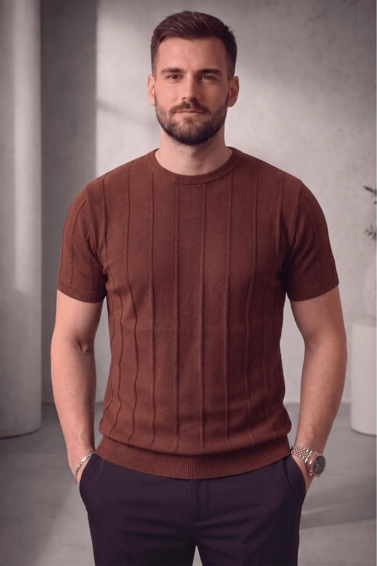 Erkek Düz Bisiklet Yaka Triko Tişört Kahverengi Cd169