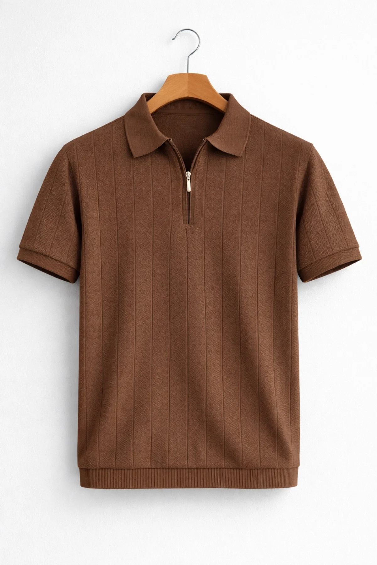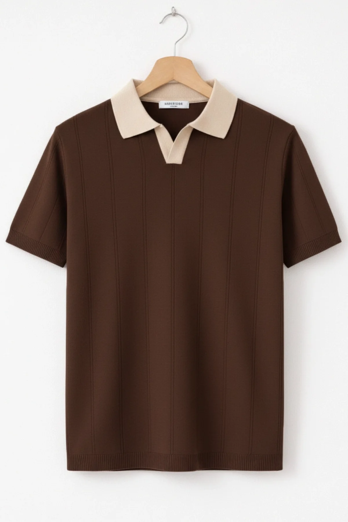 Erkek Yaka Desenli Triko Tişört Kahverengi Cd165