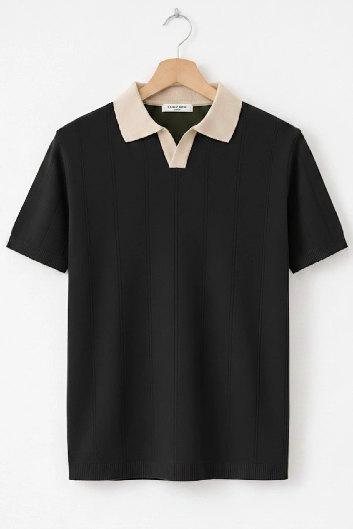 Erkek Yaka Desenli Triko Tişört Siyah Cd165
