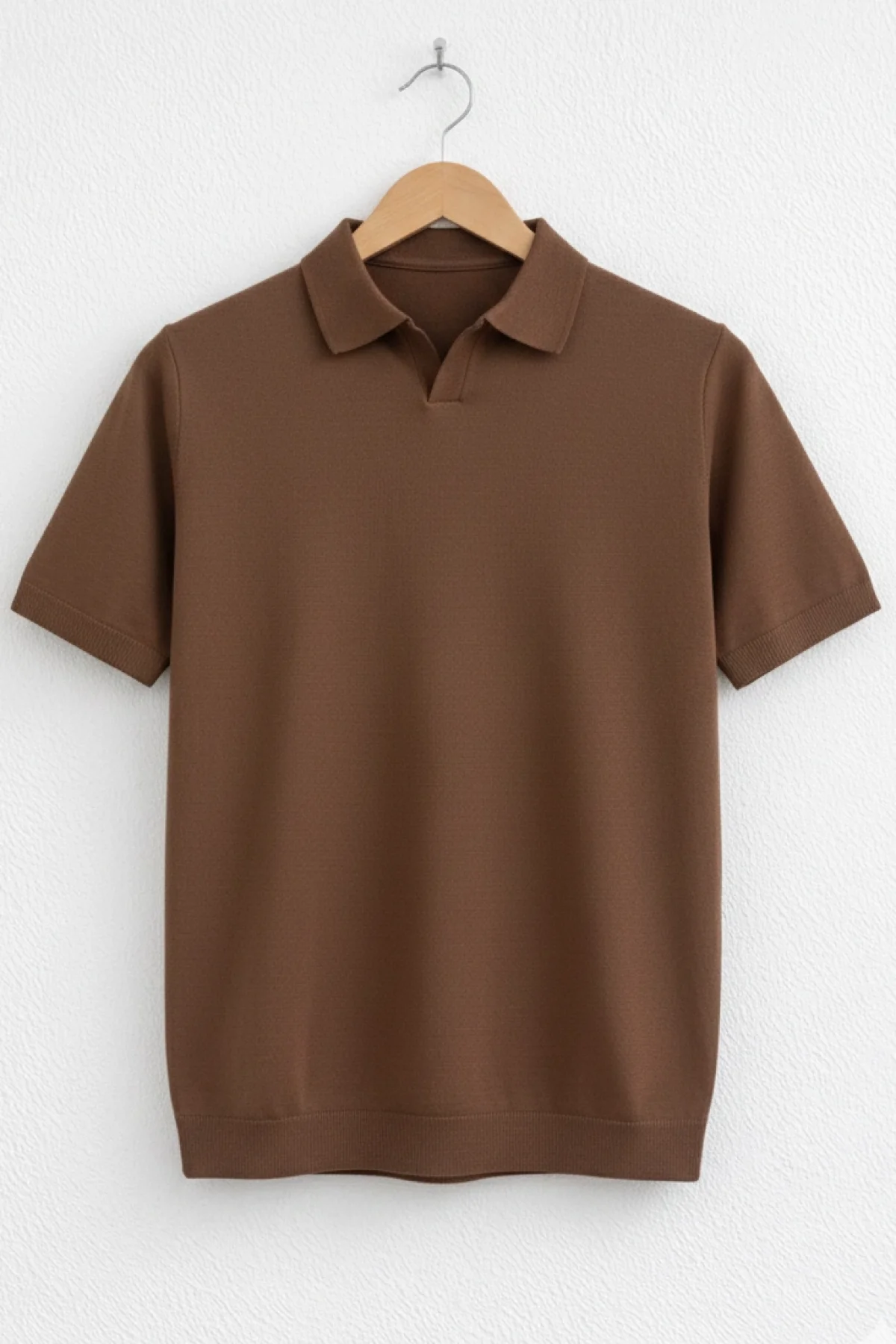 Erkek Açık Yaka Düz Triko Tişört Kahverengi Cd167