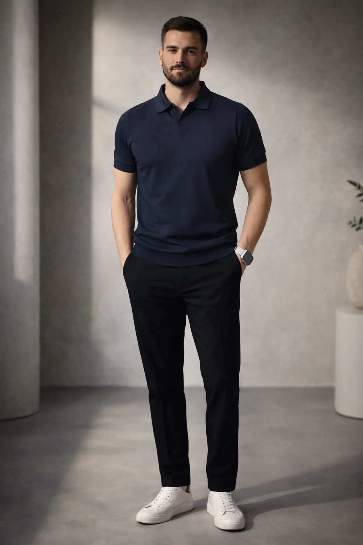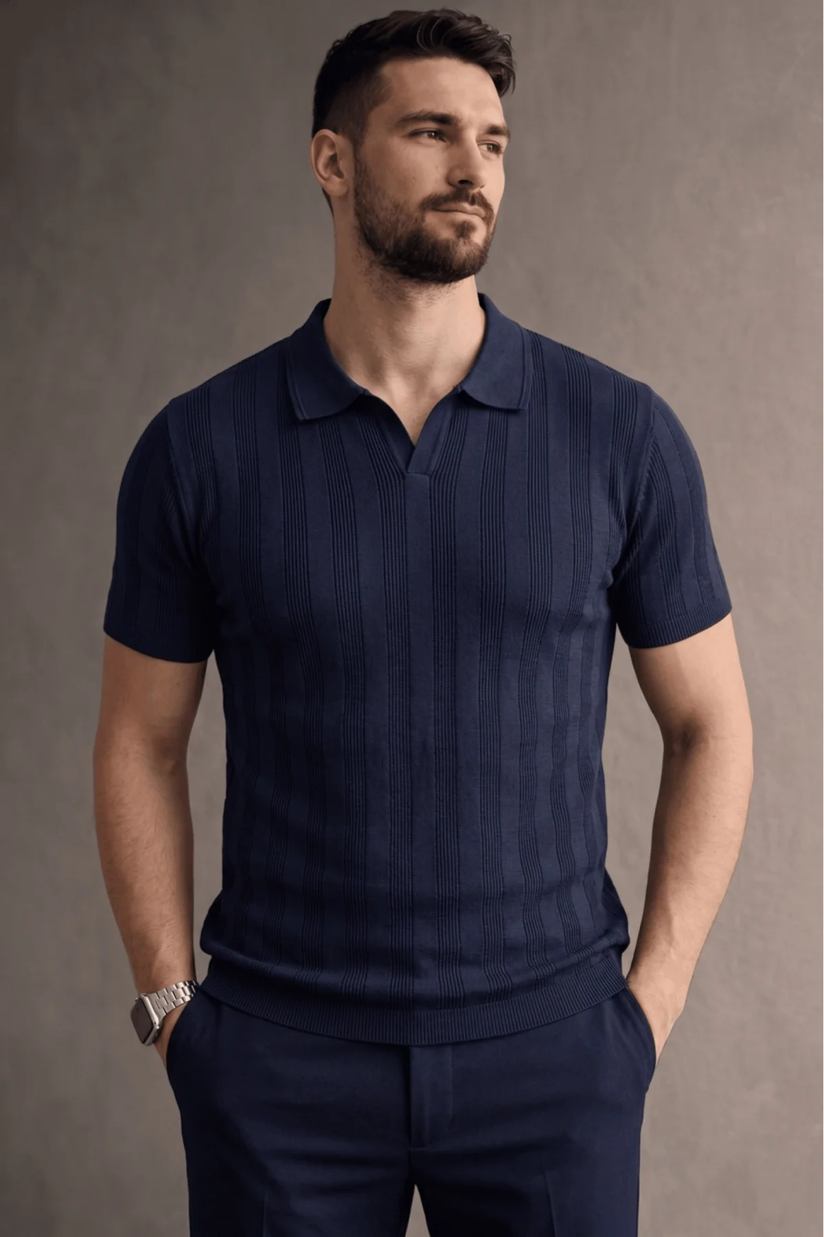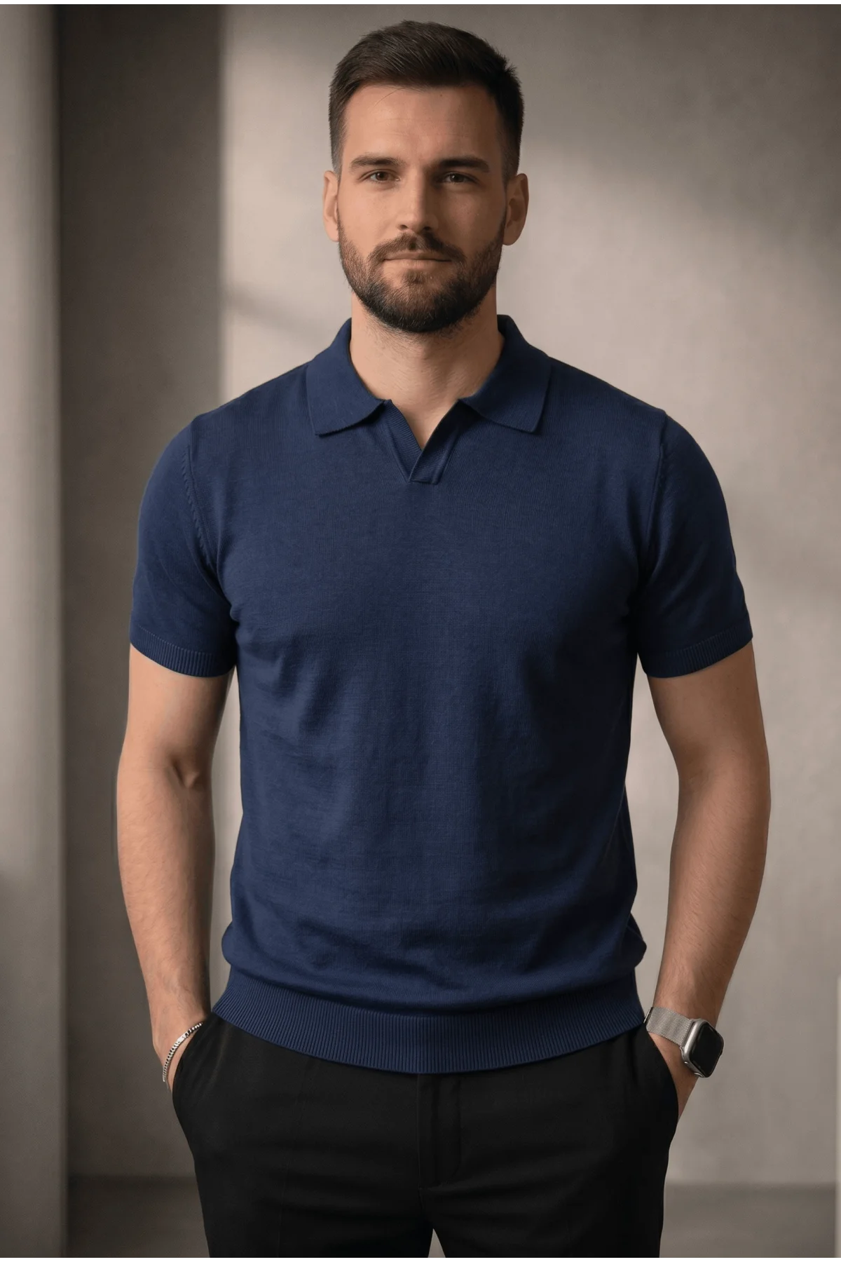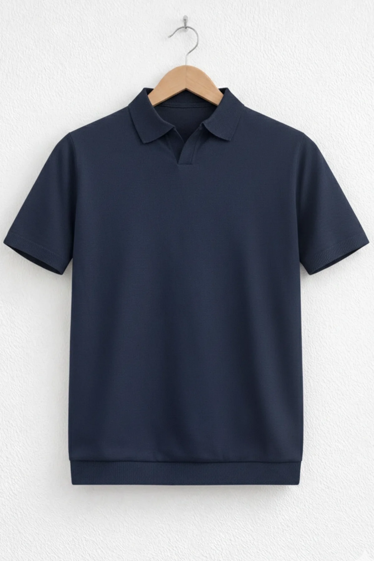 Erkek Açık Yaka Düz Triko Tişört Lacivert Cd167
