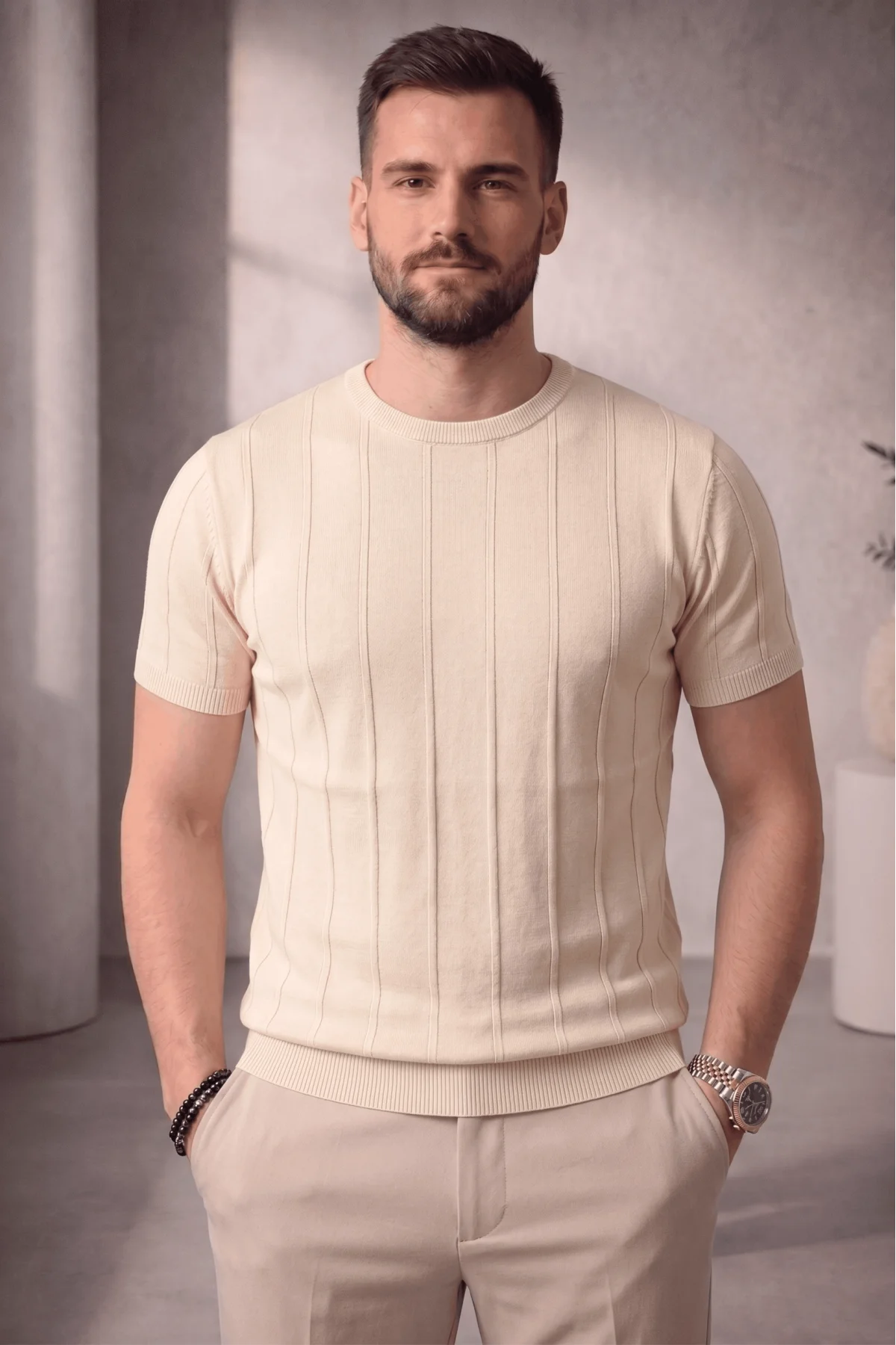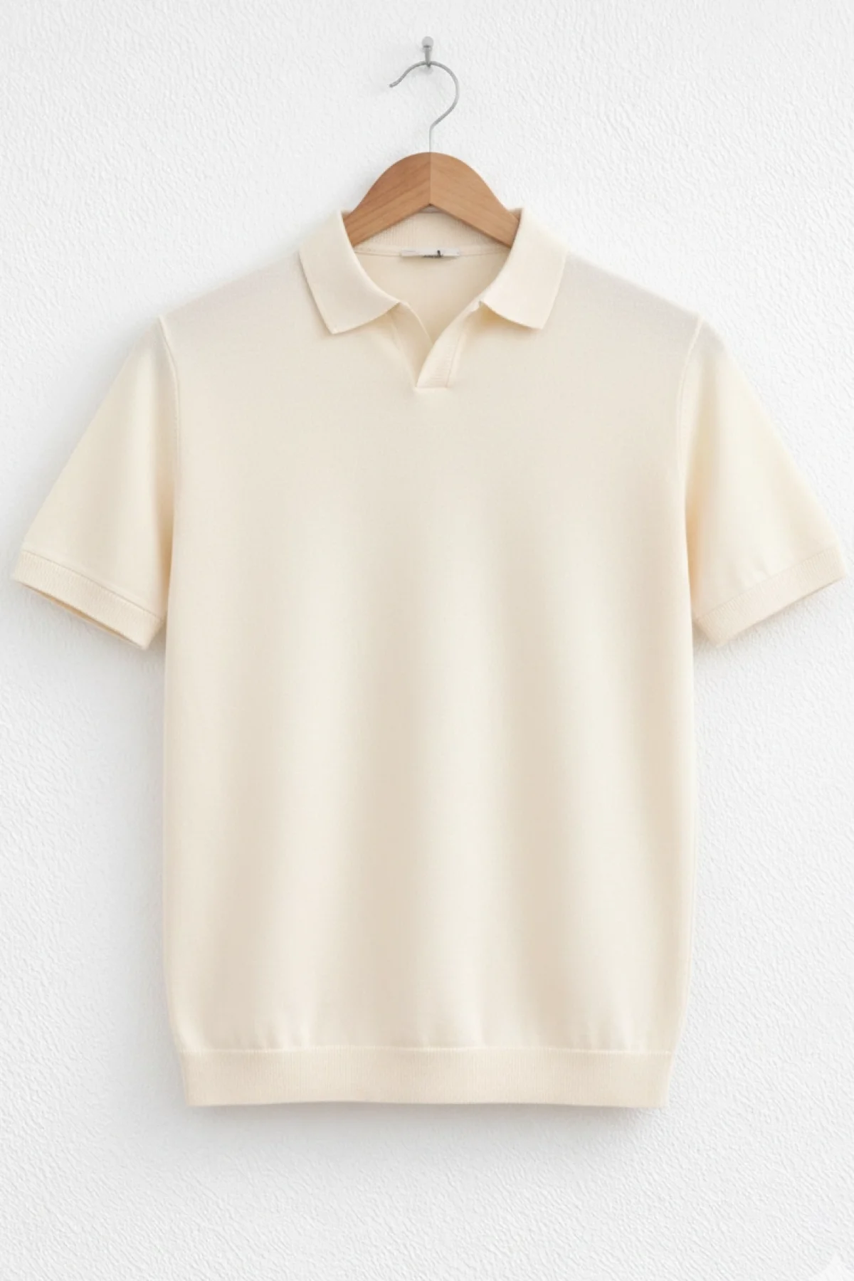 Erkek Açık Yaka Düz Triko Tişört Krem Cd167