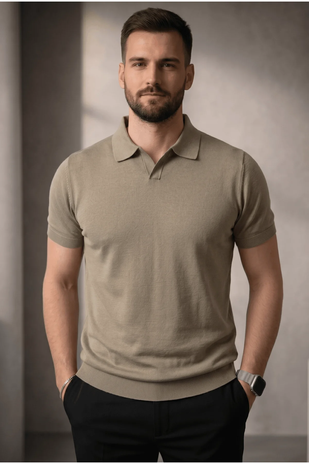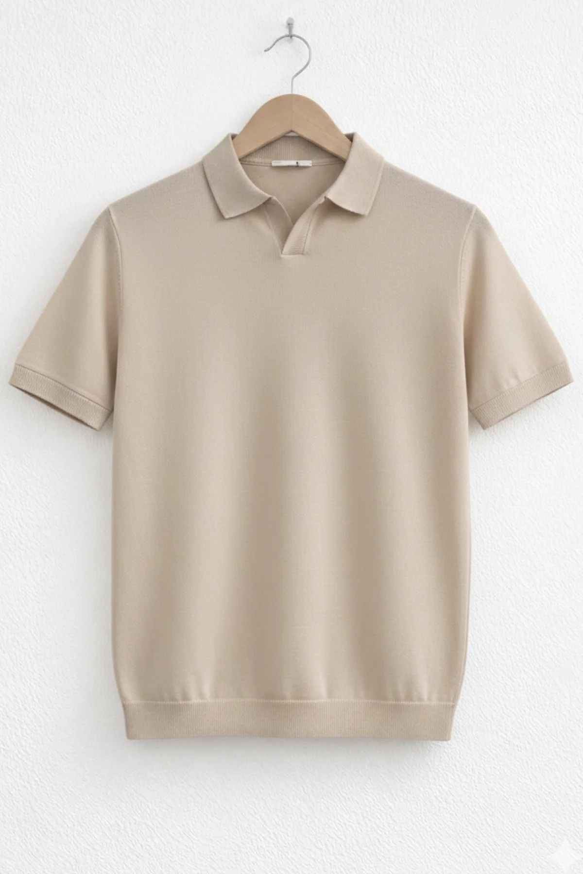 Erkek Açık Yaka Düz Triko Tişört Vizon Cd167