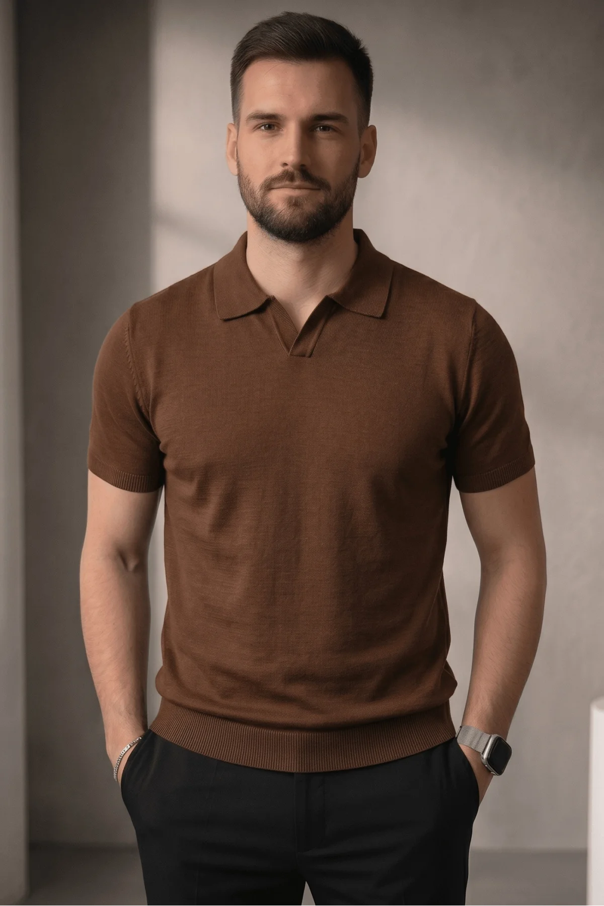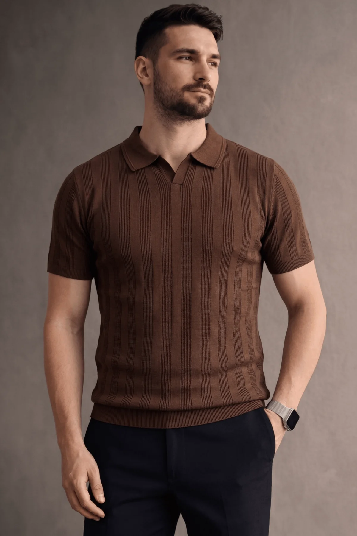 Erkek Açık Yaka Triko Tişört Kahverengi Cd103
