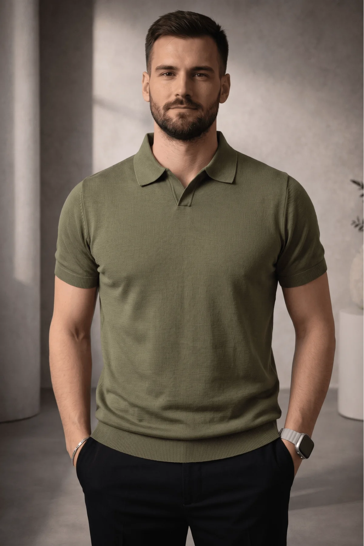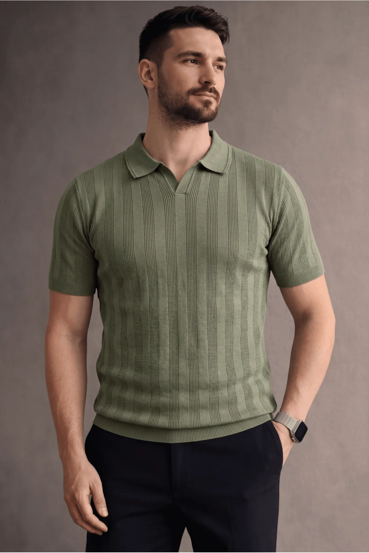 Erkek Açık Yaka Triko Tişört Haki Cd103
