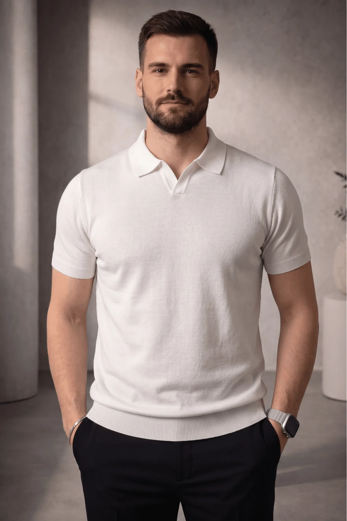 Erkek Açık Yaka Düz Triko Tişört Beyaz Cd167
