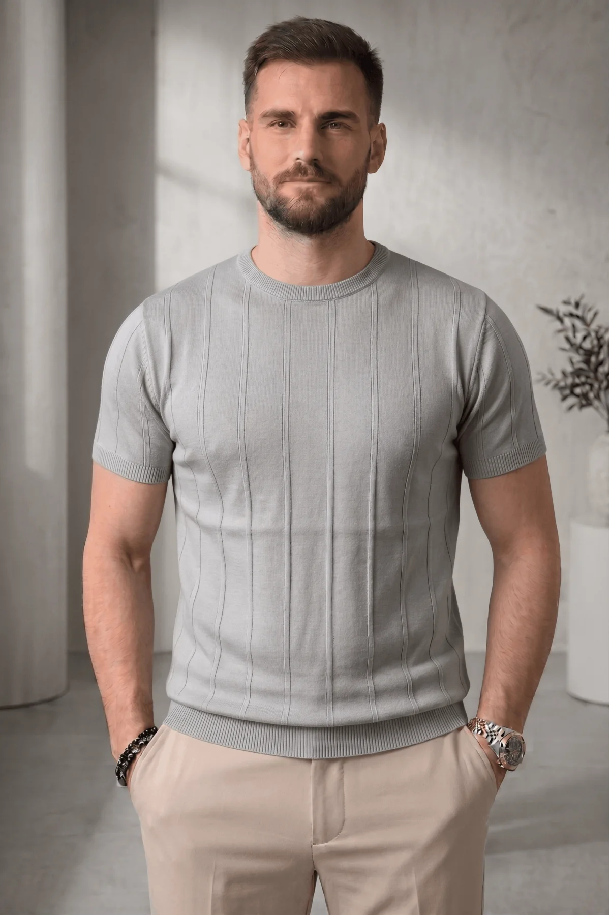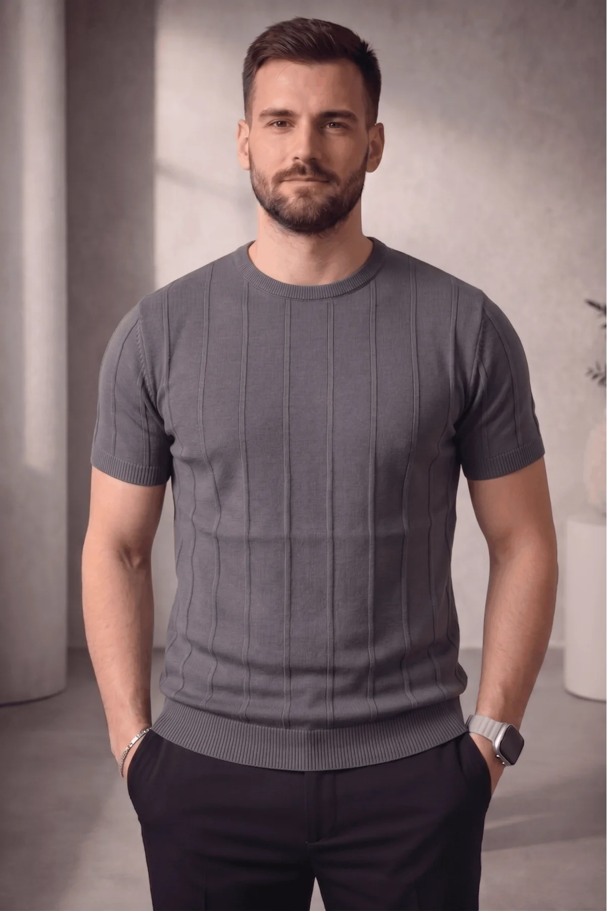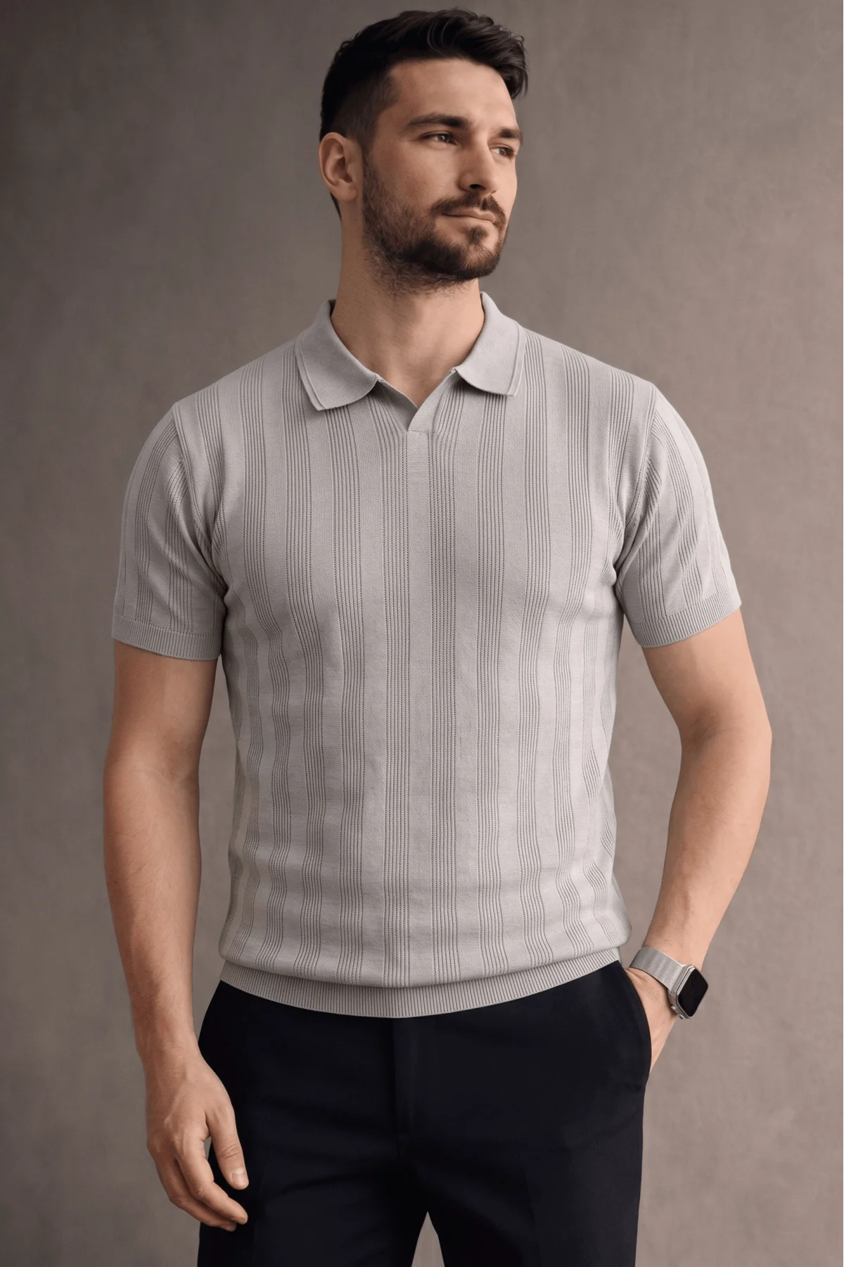 Erkek Açık Yaka Triko Tişört Gri Cd103