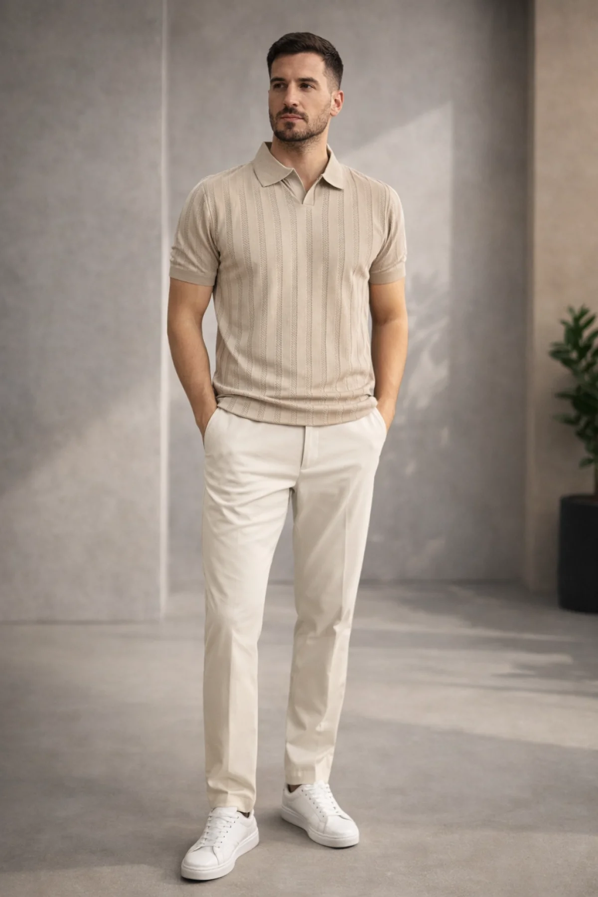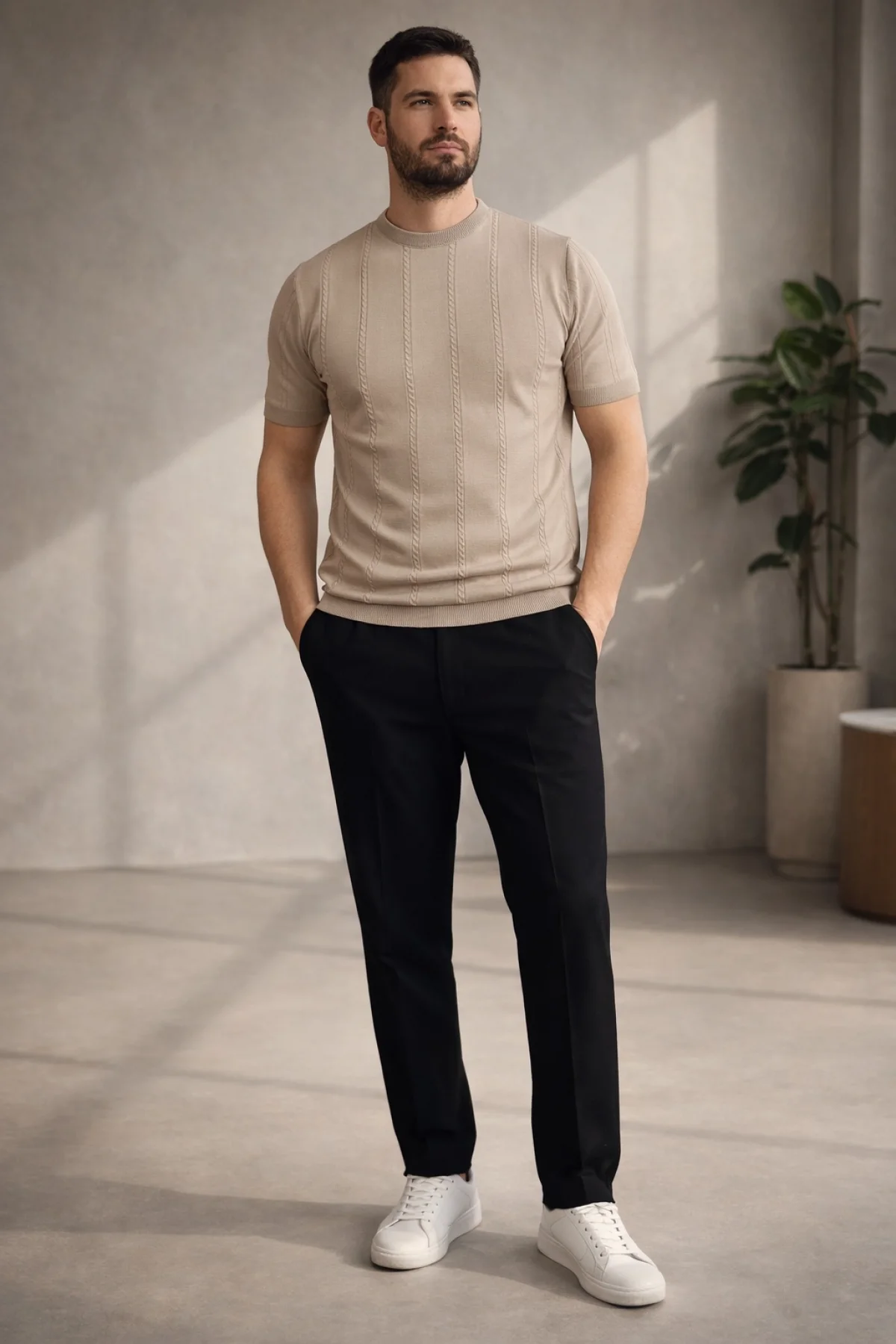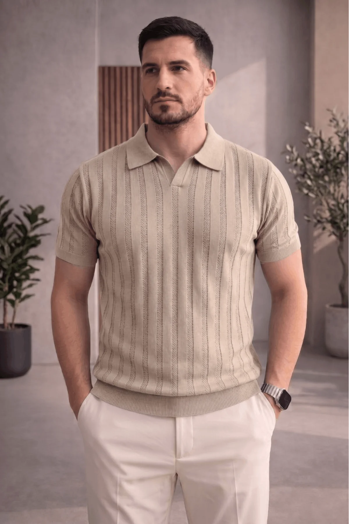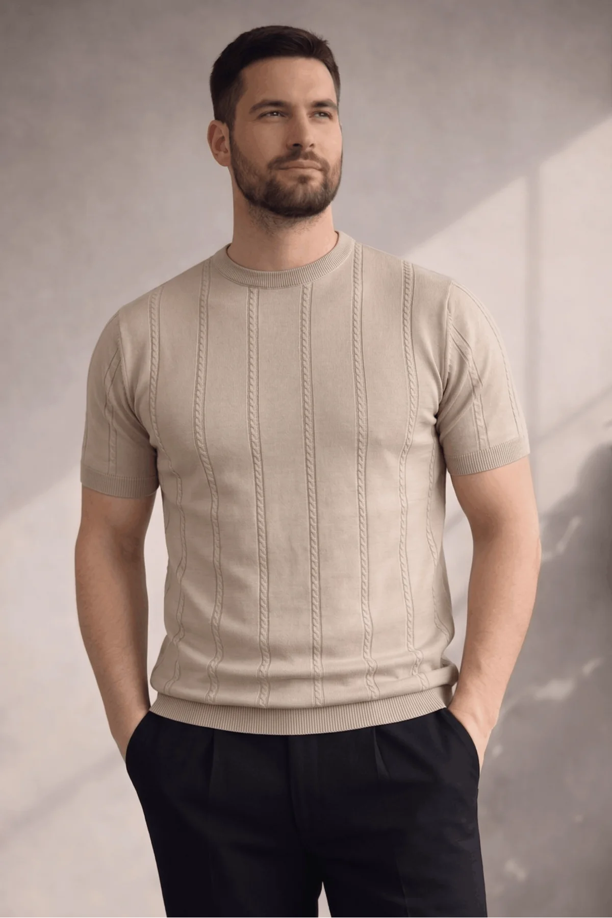 Erkek Açık Yaka Desenli Triko Tişört Vizon Cd162