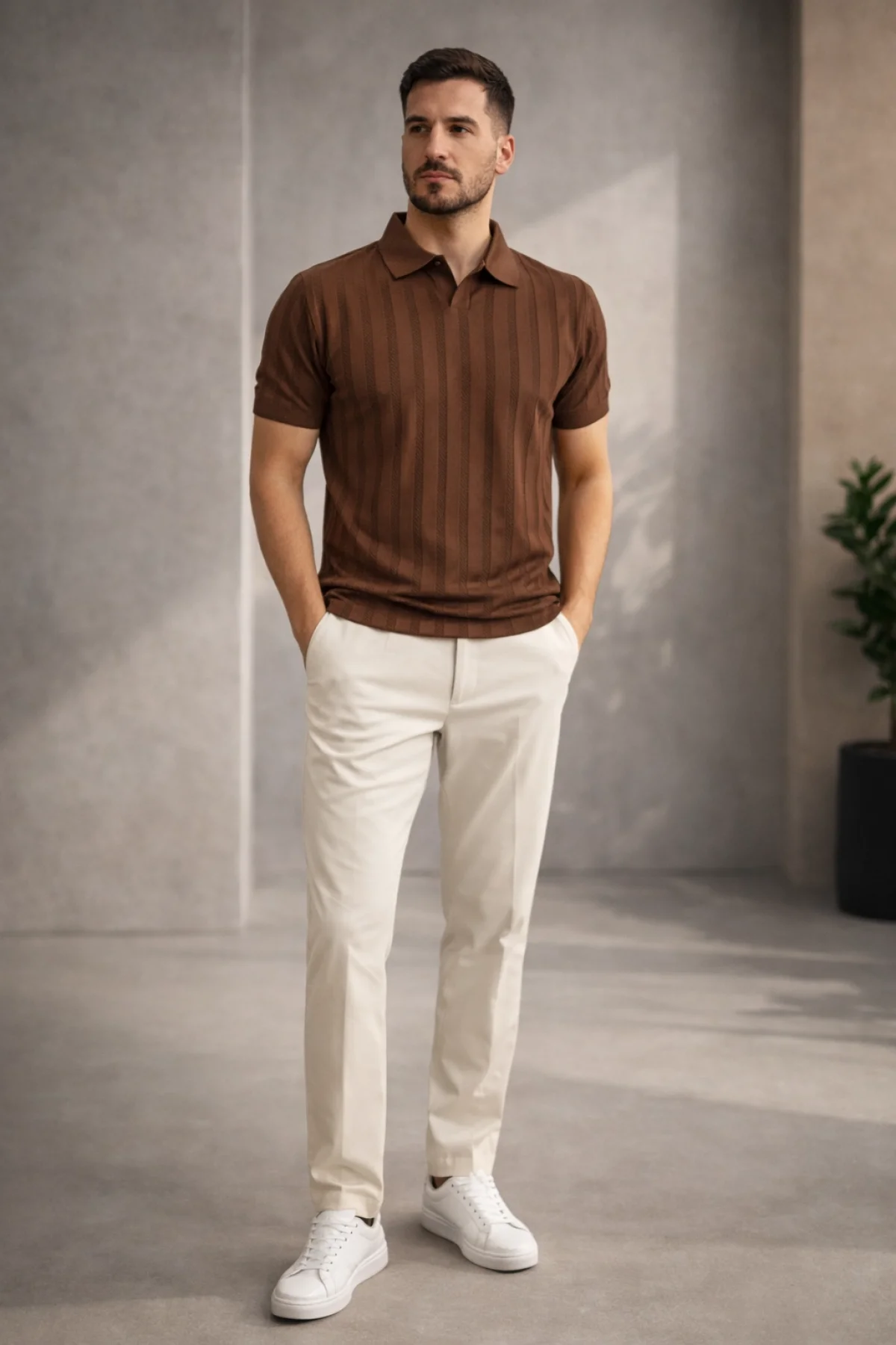 Erkek Bisiklet Yaka Çizgili Triko Tişört Kahverengi Cd163