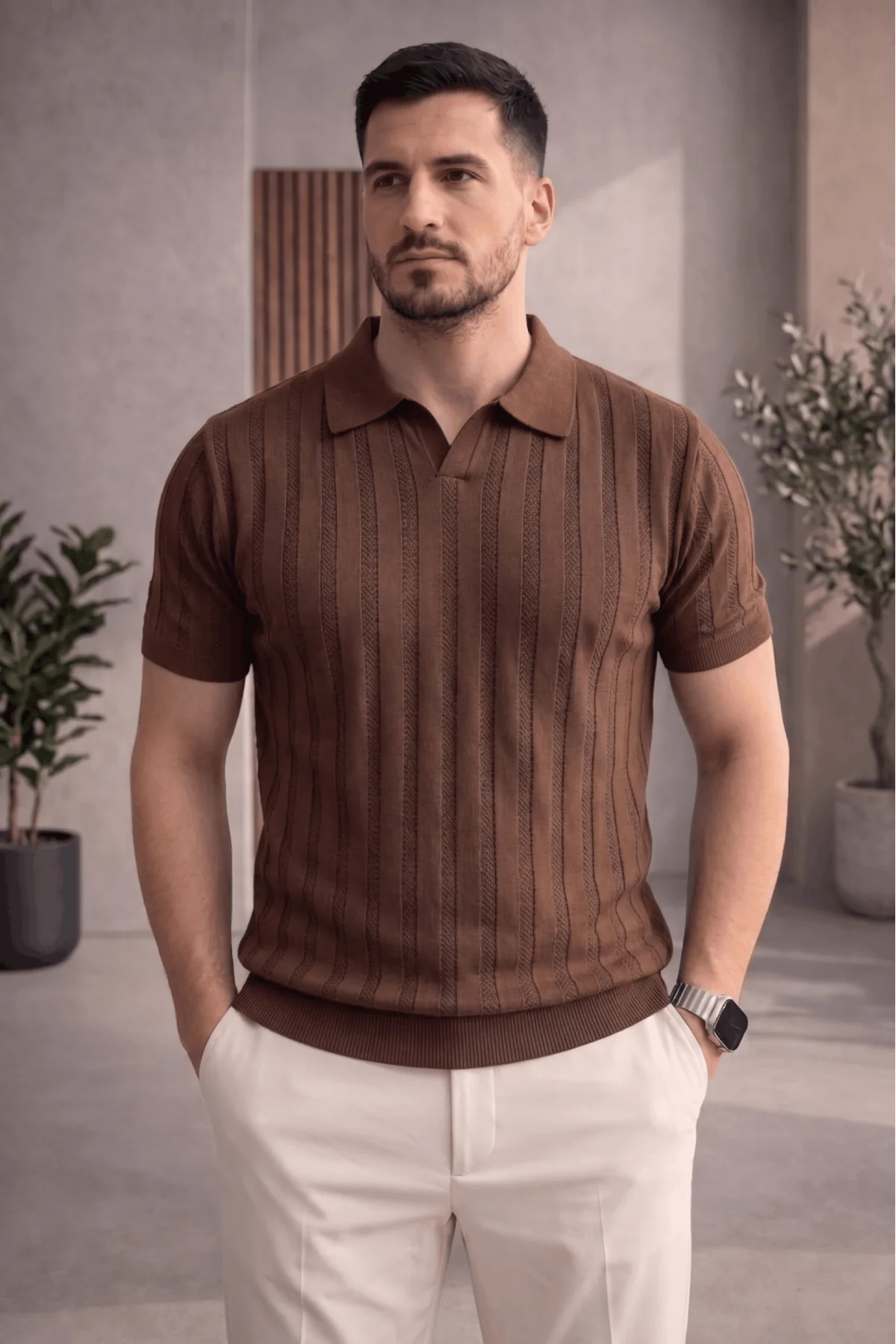 Erkek Açık Yaka Desenli Triko Tişört Kahverengi Cd162