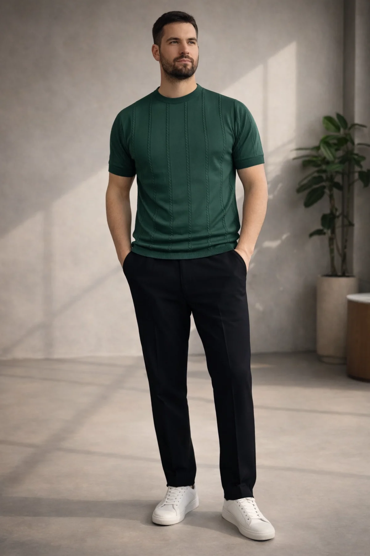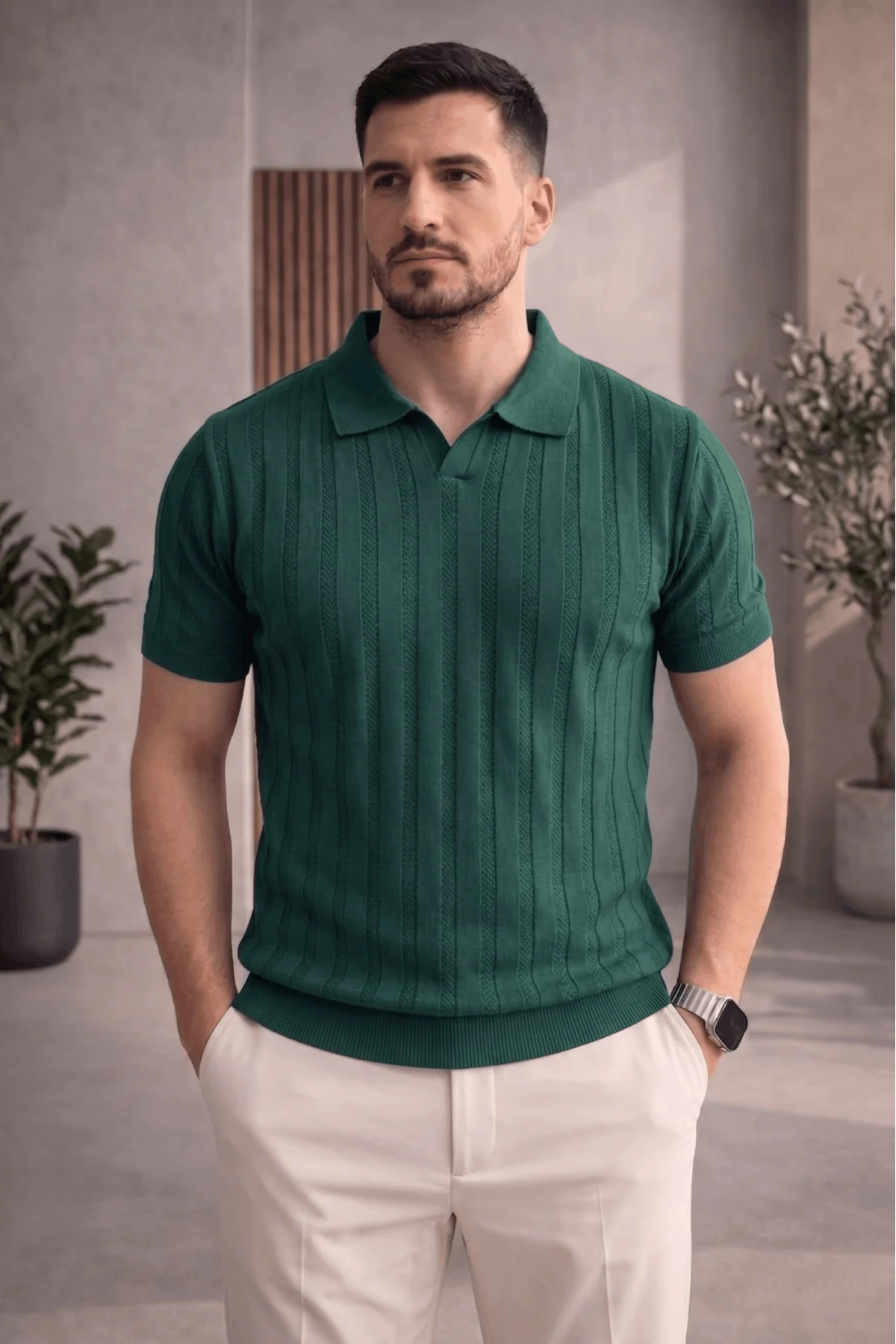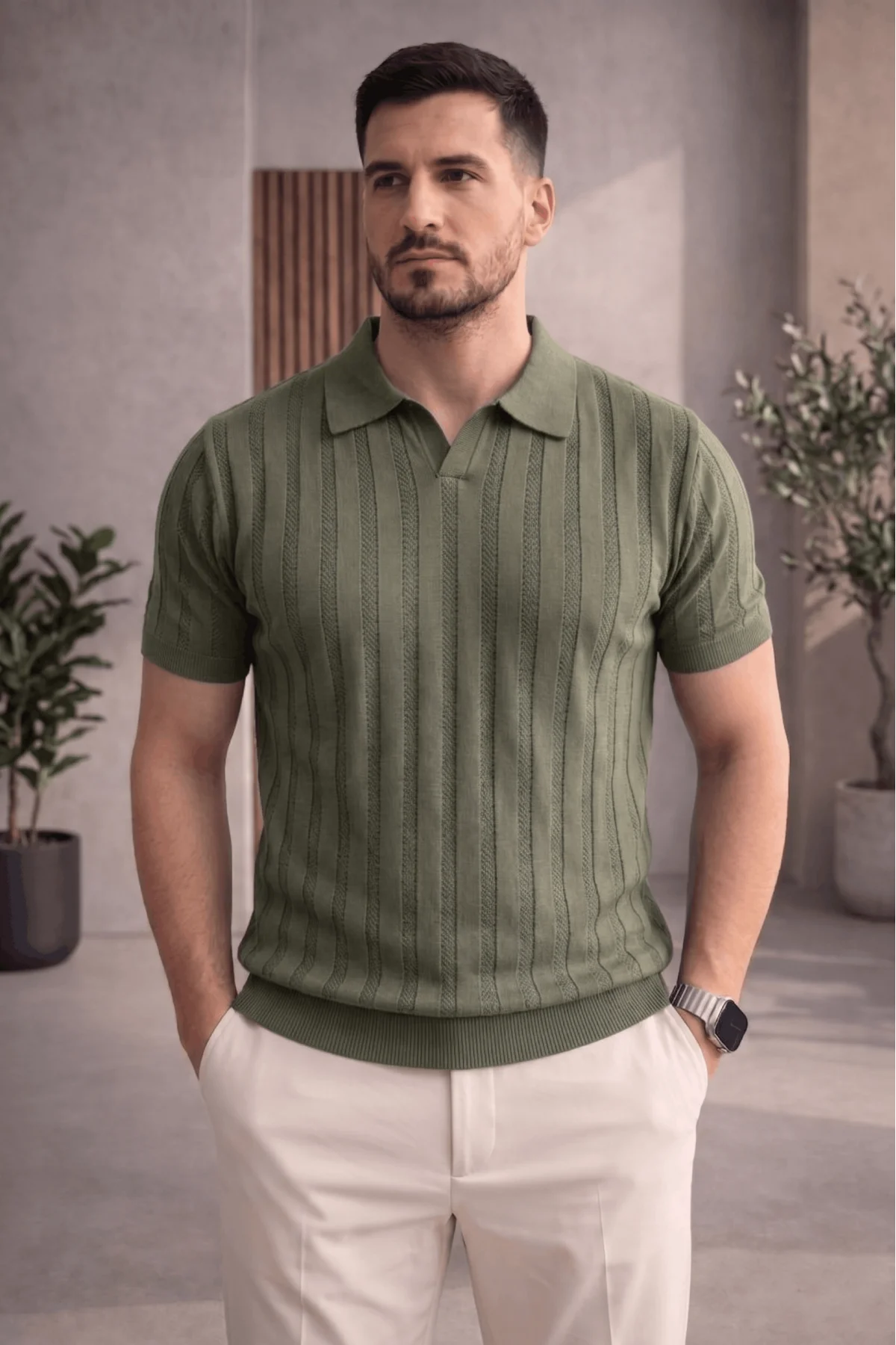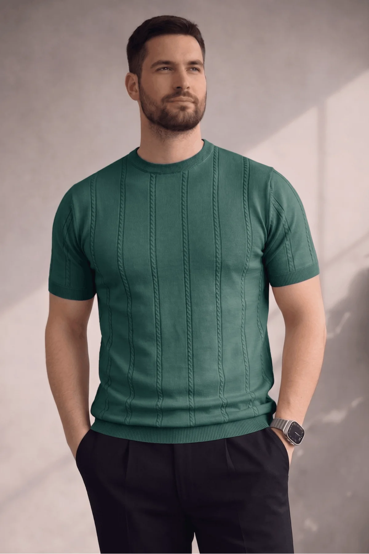 Erkek Açık Yaka Desenli Triko Tişört Yeşil Cd162