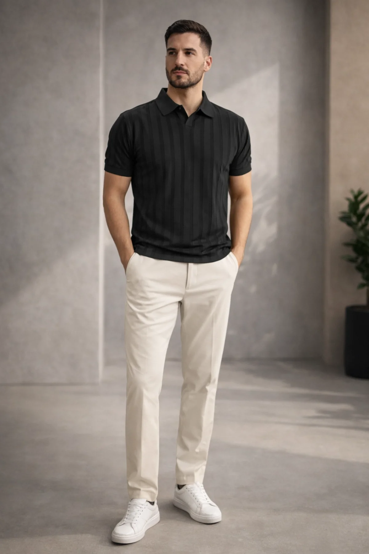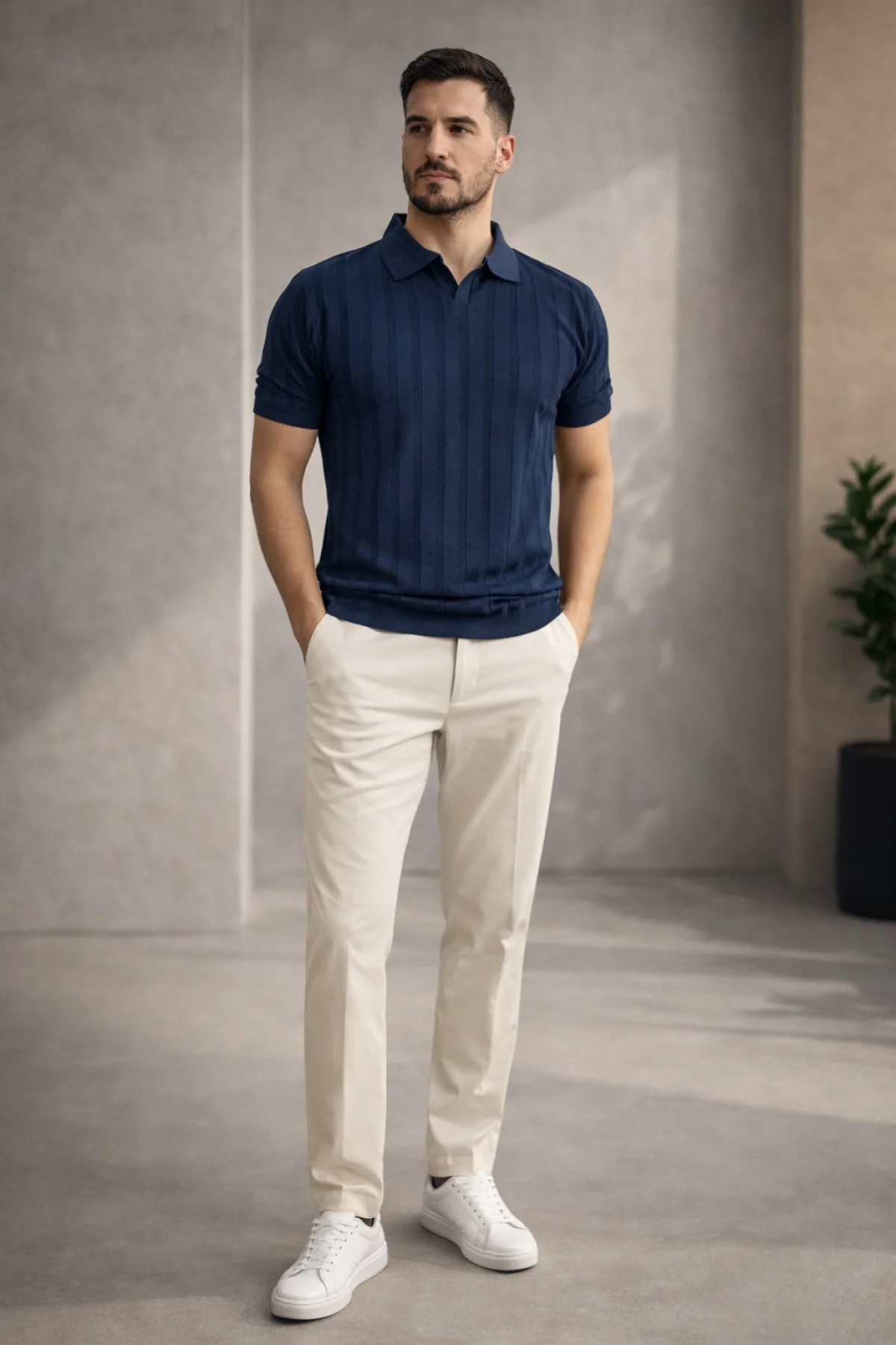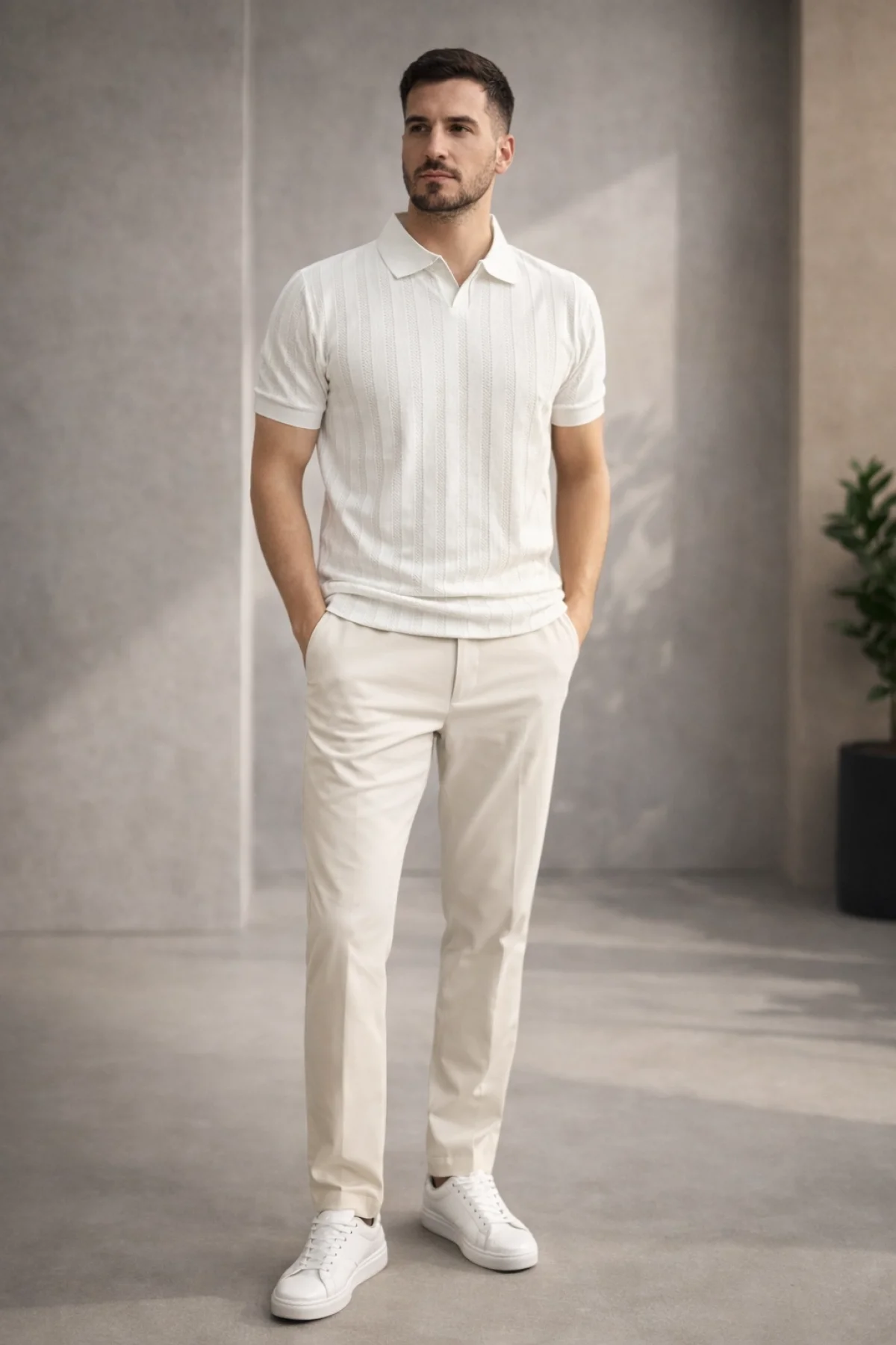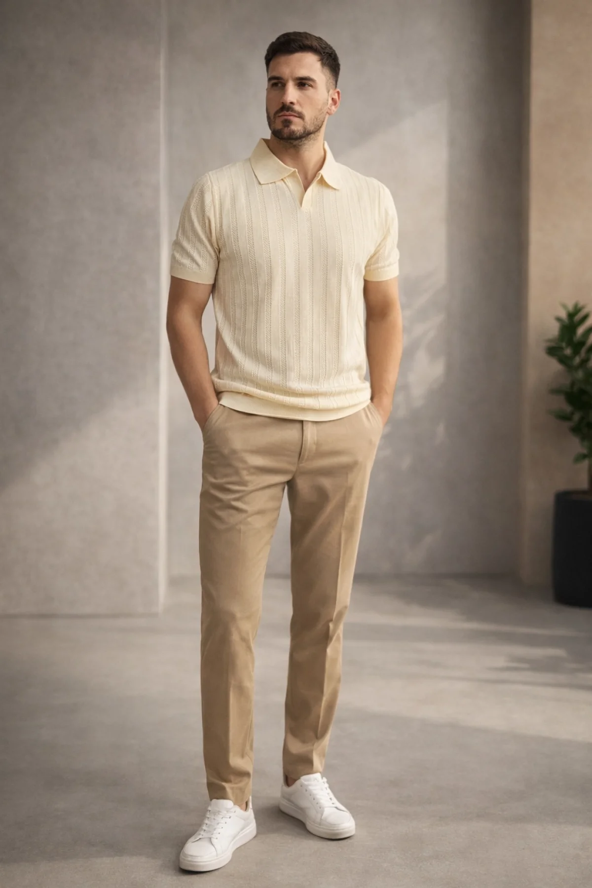 Erkek Açık Yaka Desenli Triko Tişört Krem Cd162