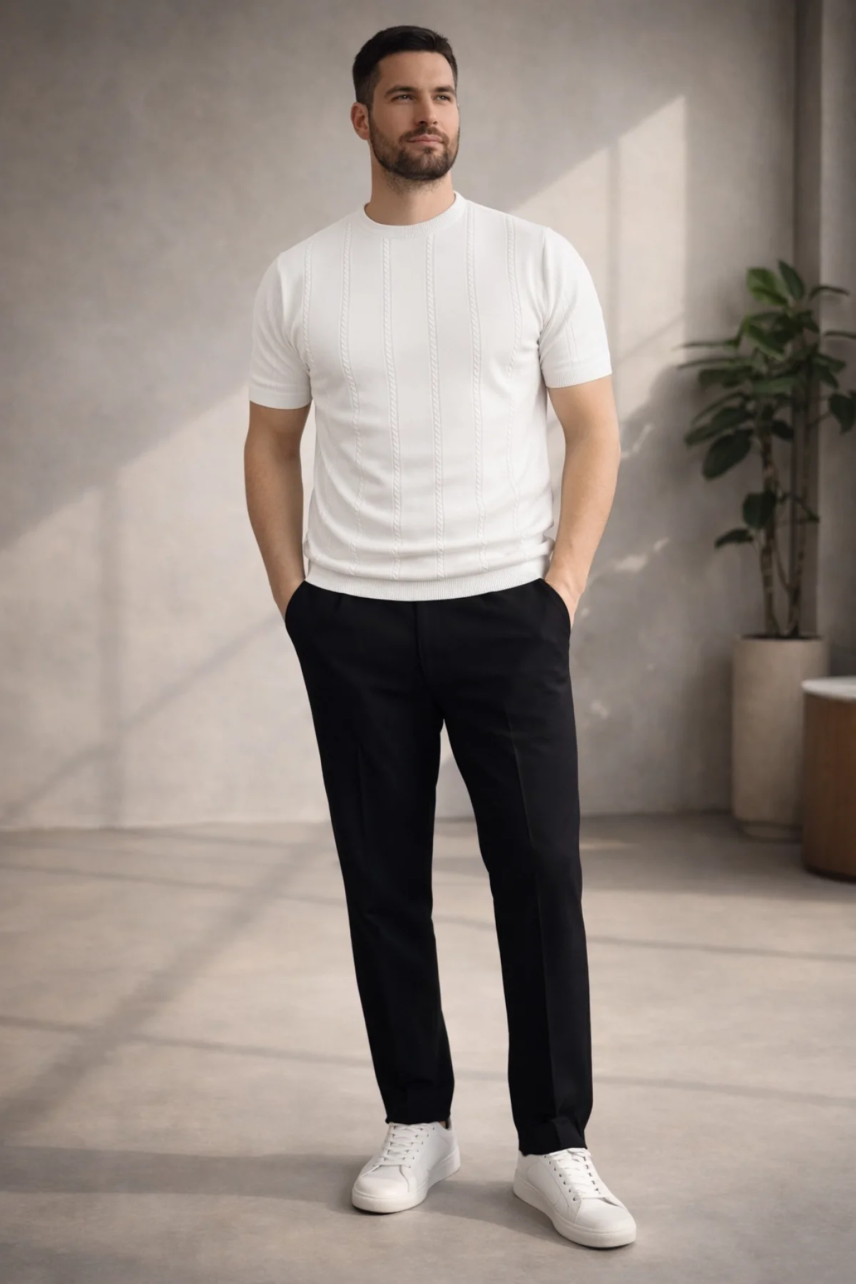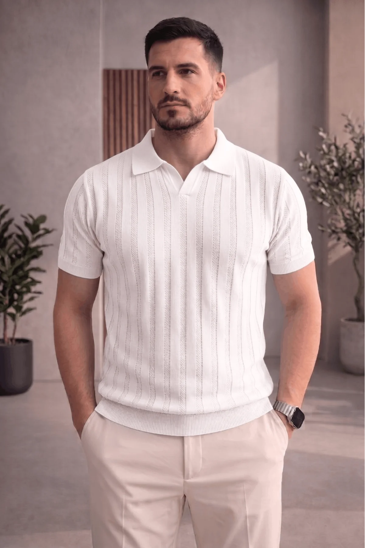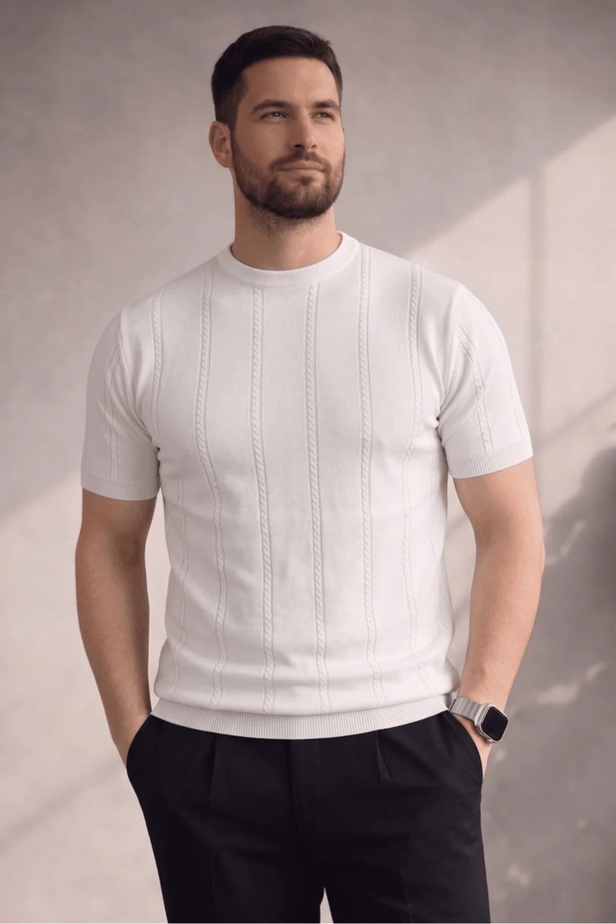 Erkek Açık Yaka Desenli Triko Tişört Beyaz Cd162