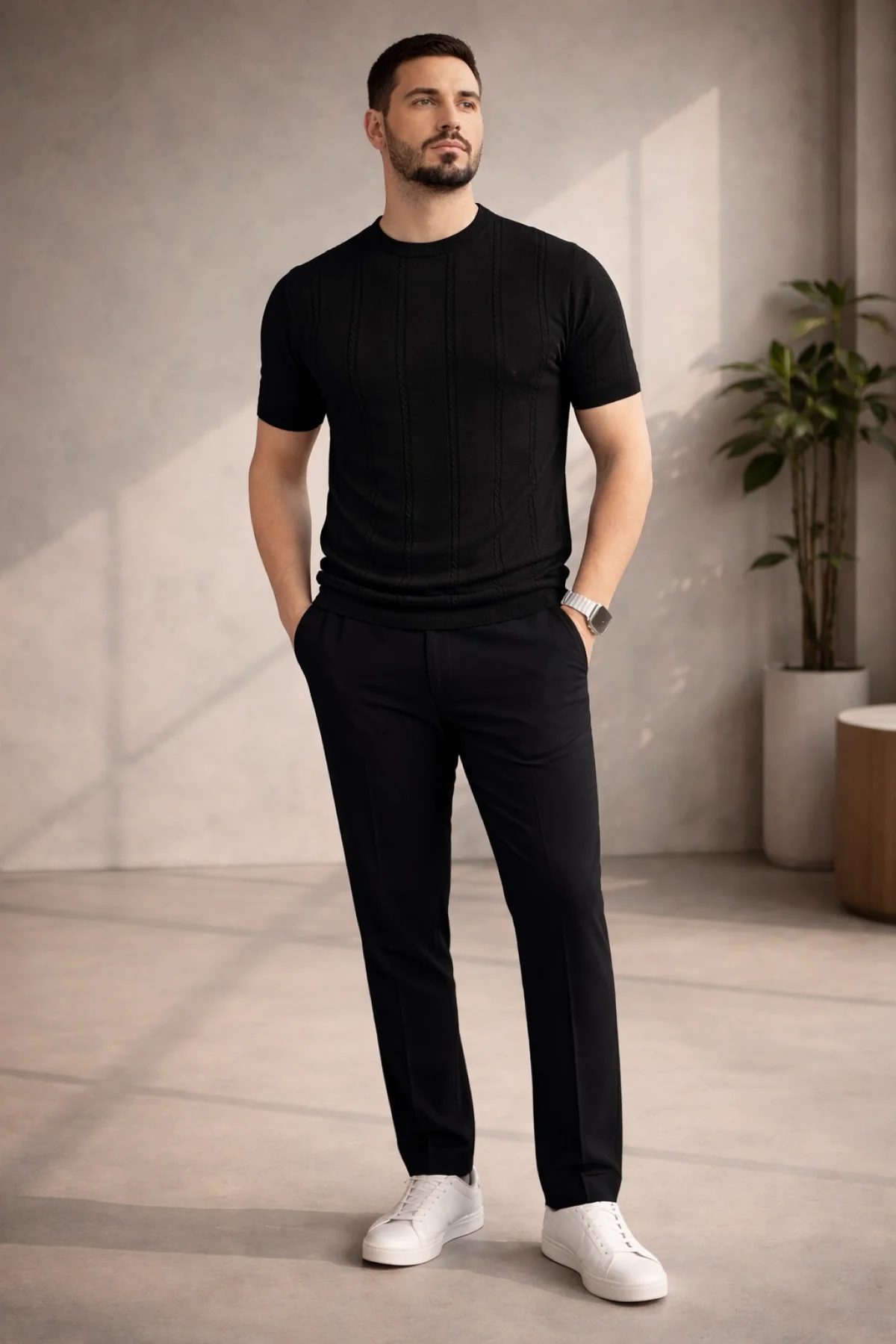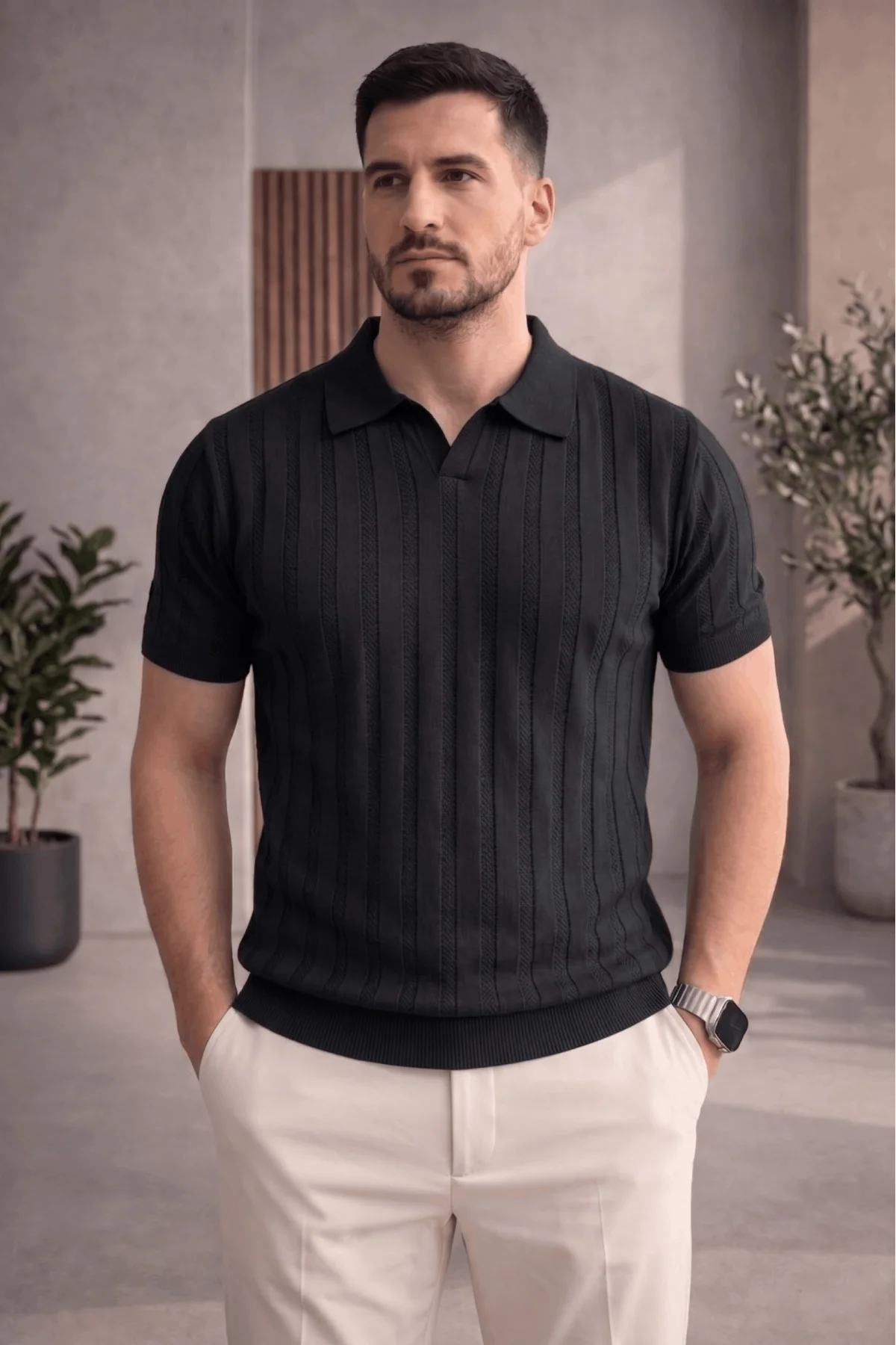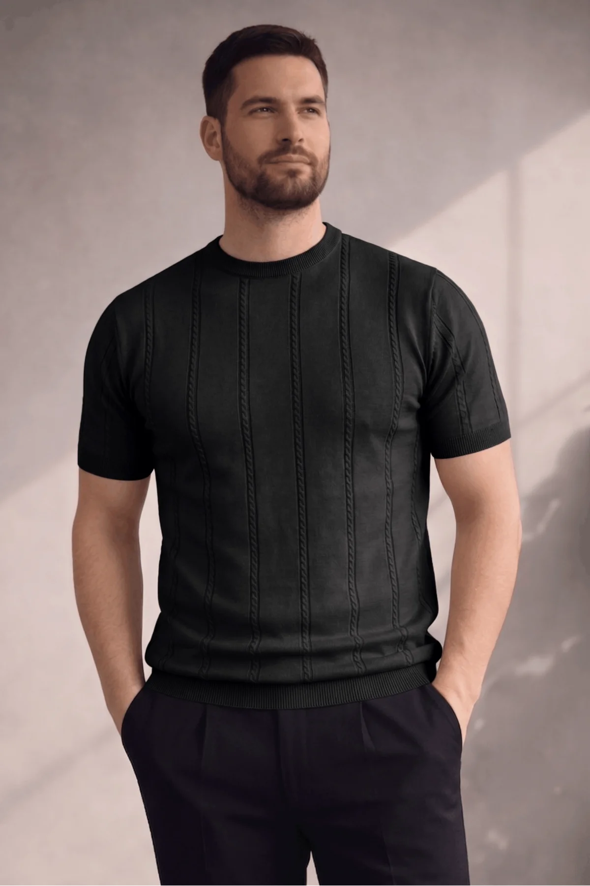 Erkek Açık Yaka Desenli Triko Tişört Siyah Cd162