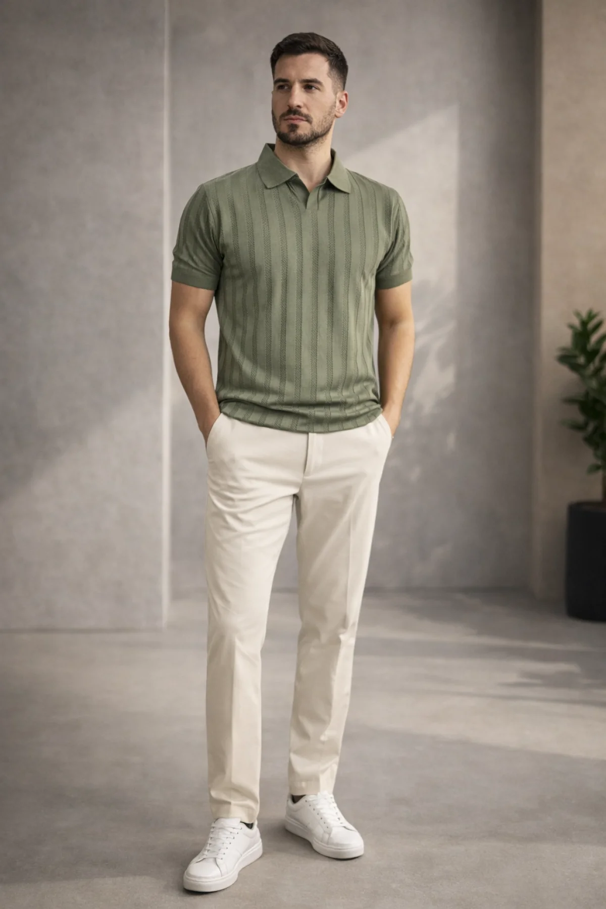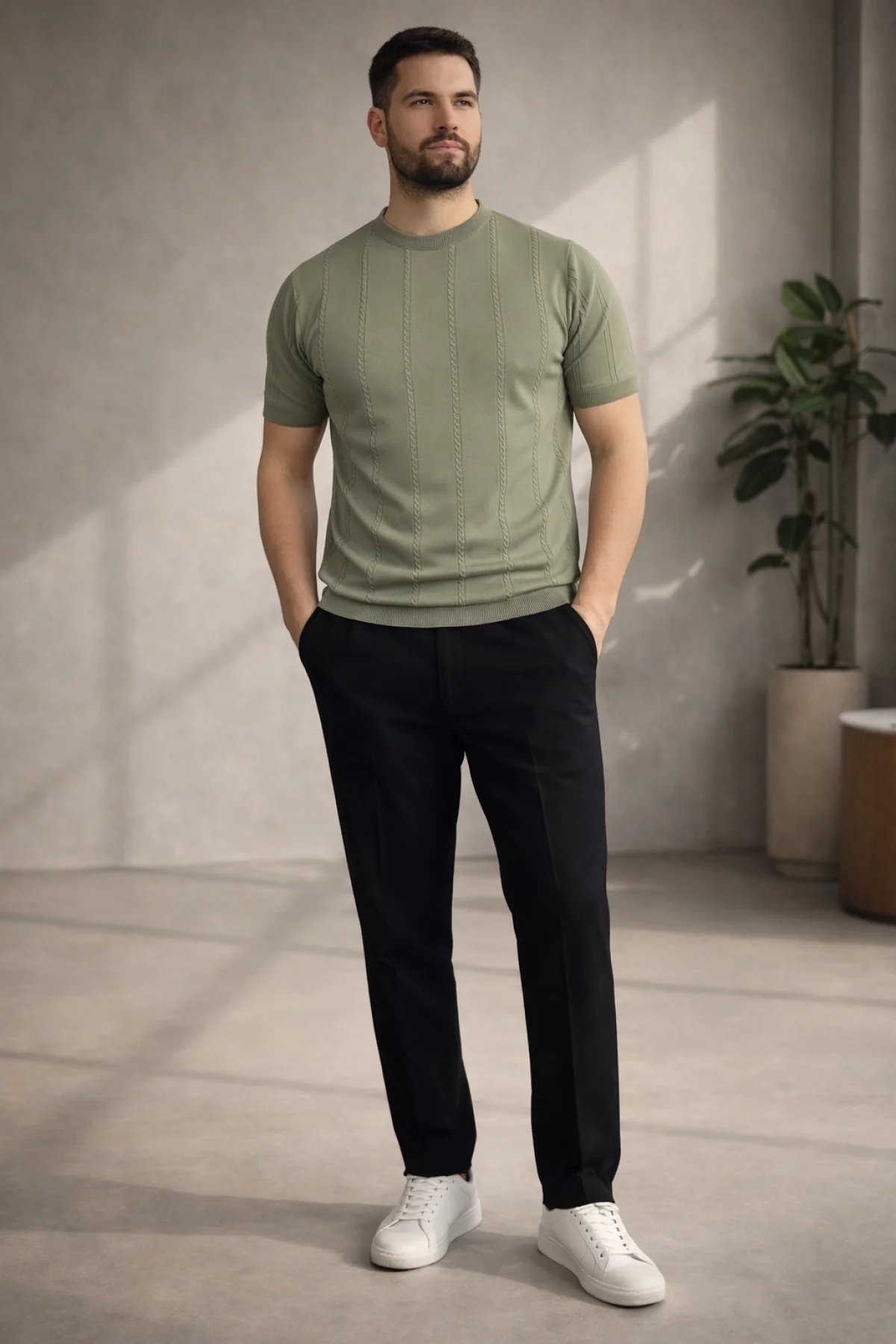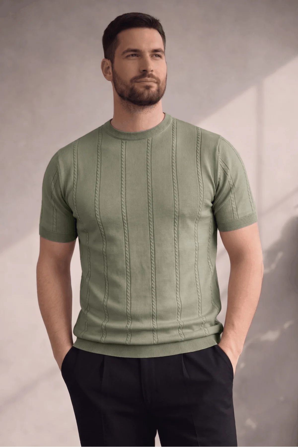 Erkek Açık Yaka Desenli Triko Tişört Açık Yeşil Cd162